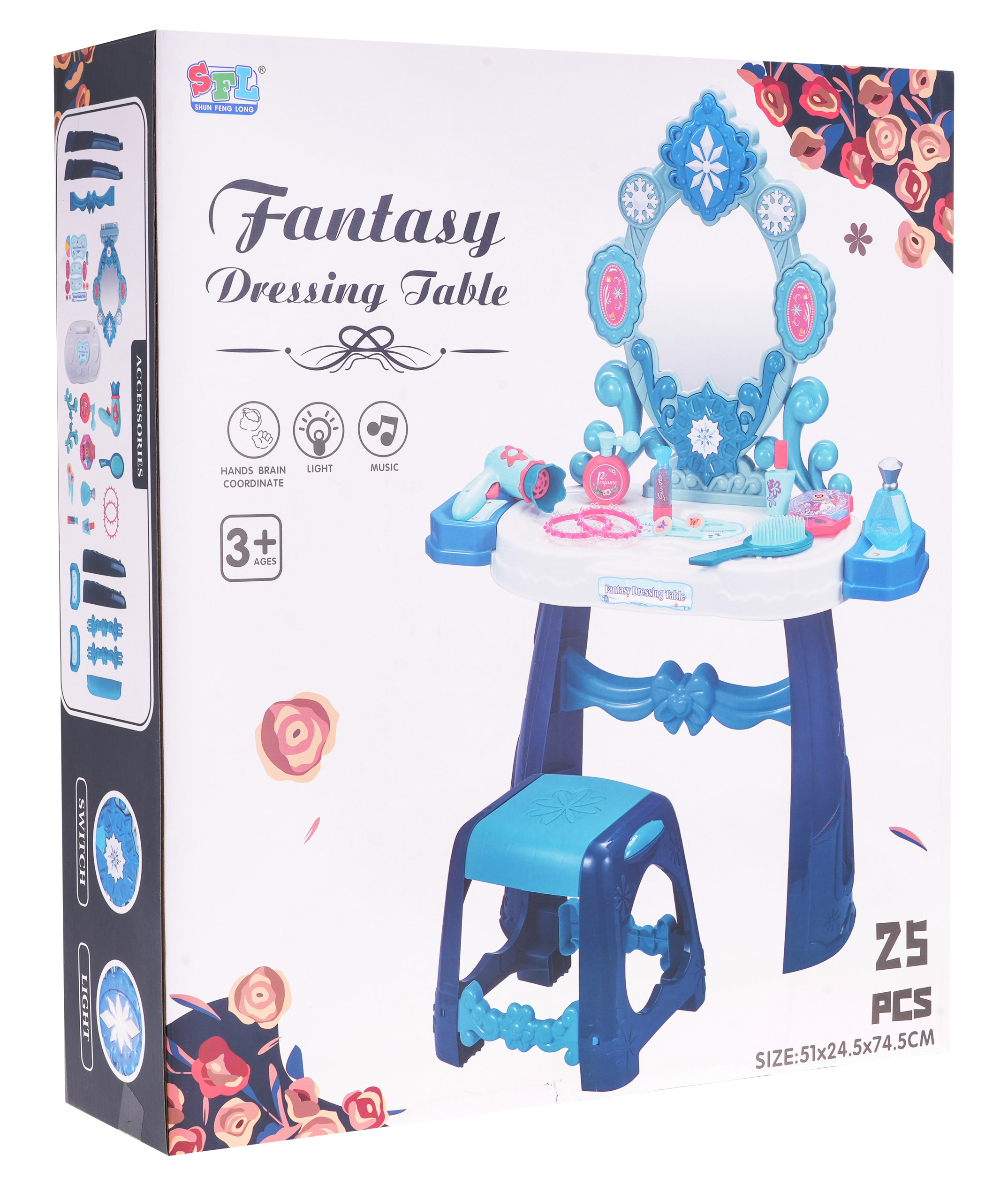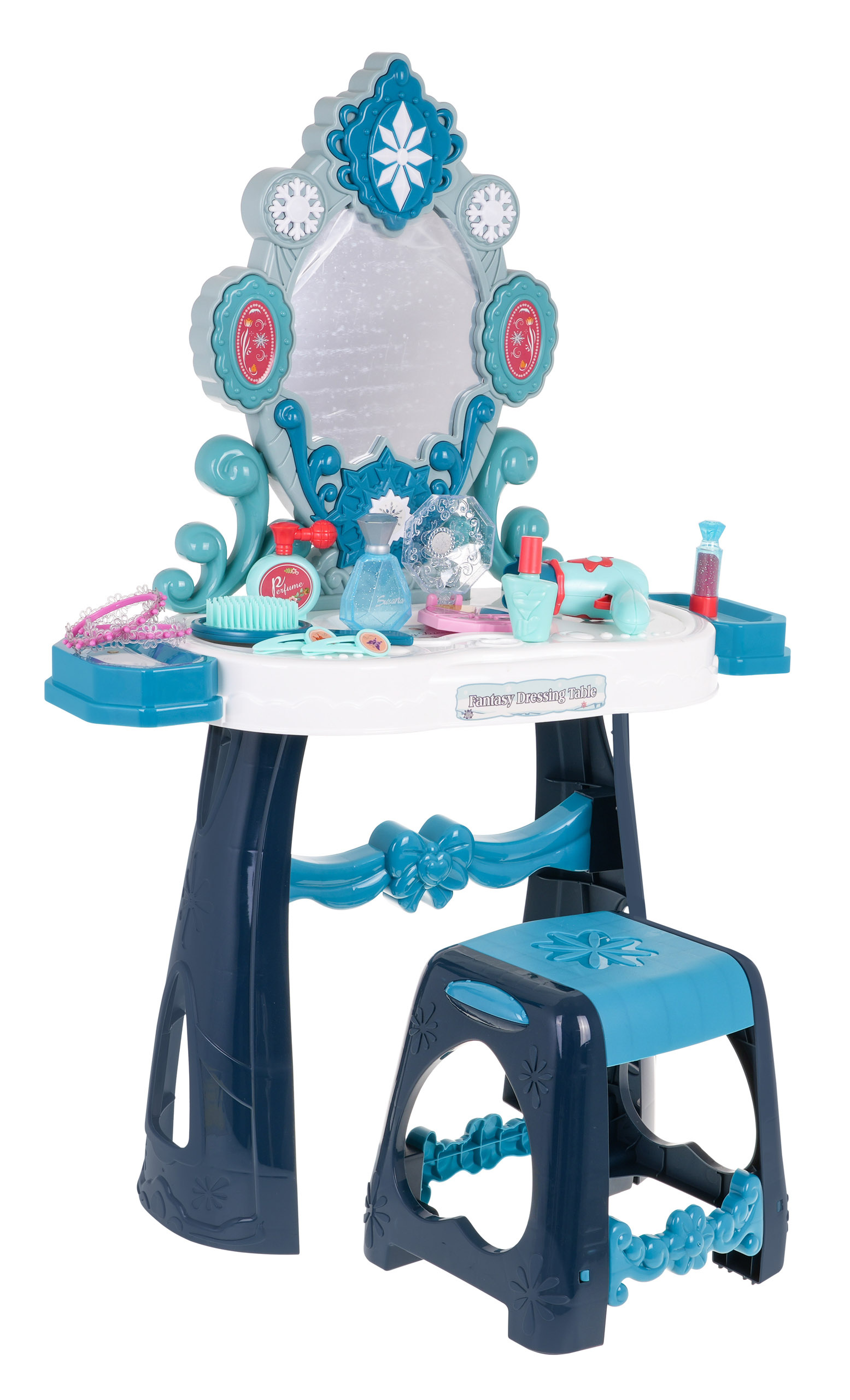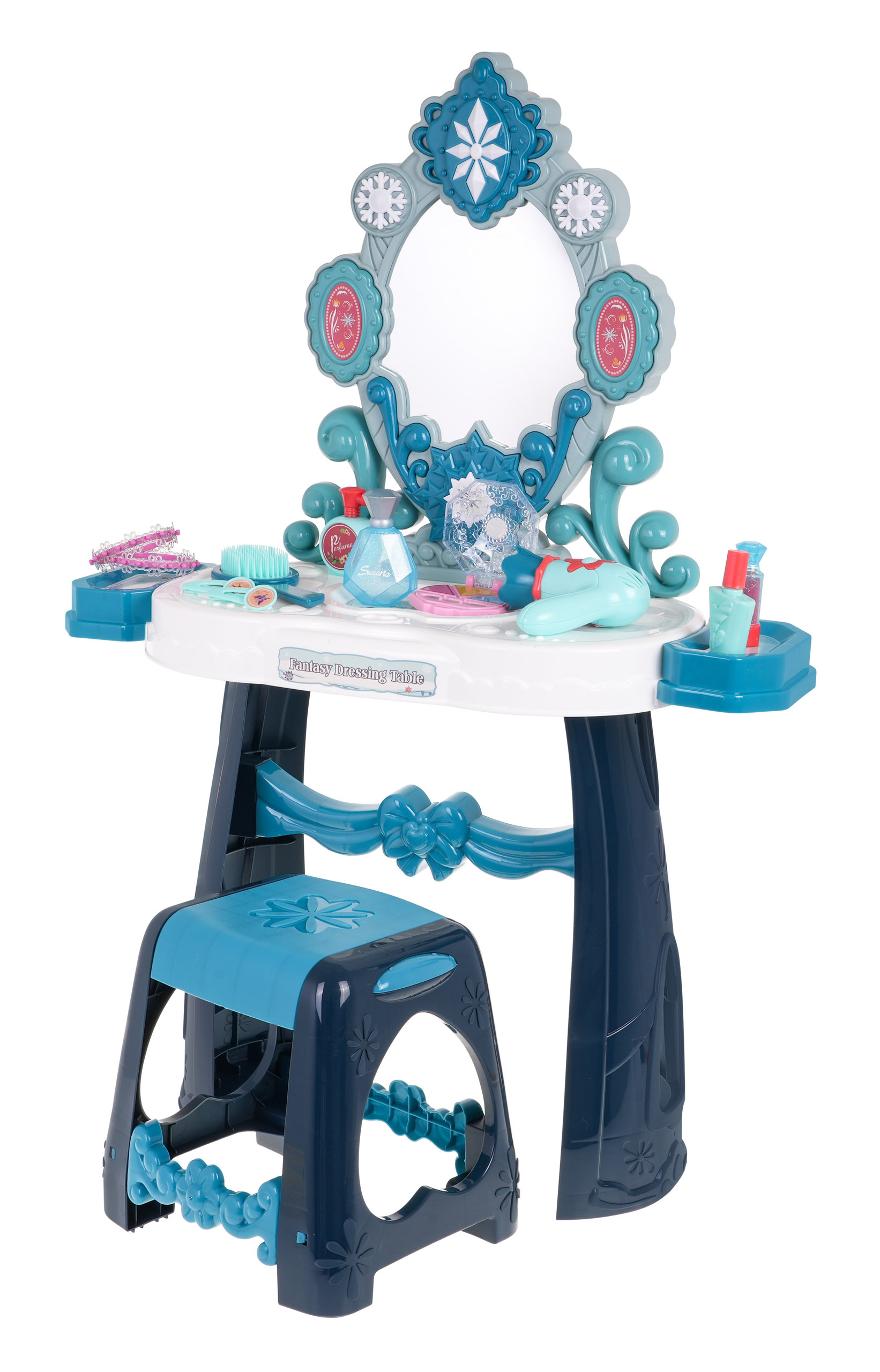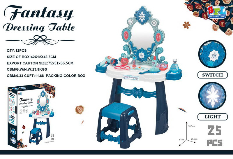 Interaktivní toaletní stolek se zrcadlem, stoličkou a doplňky pro malou princeznu od tří let. Hračka má zvukovou a světelnou funkci (blikající hvězda nad zrcadlem a dvě hvězdy po stranách zrcadla). Hračka je napájena 3 bateriemi AA 1,5 V (nejsou součástí balení). Součástí balení je fén, kartáč a atrapa kosmetiky.