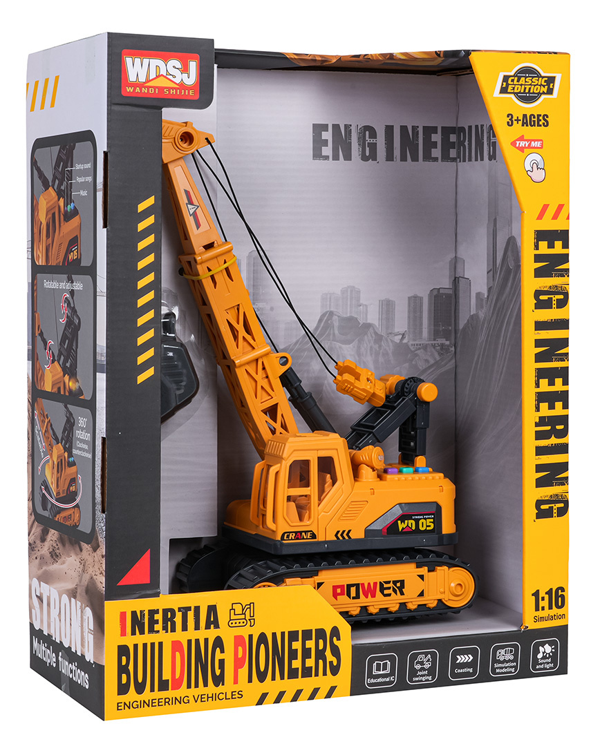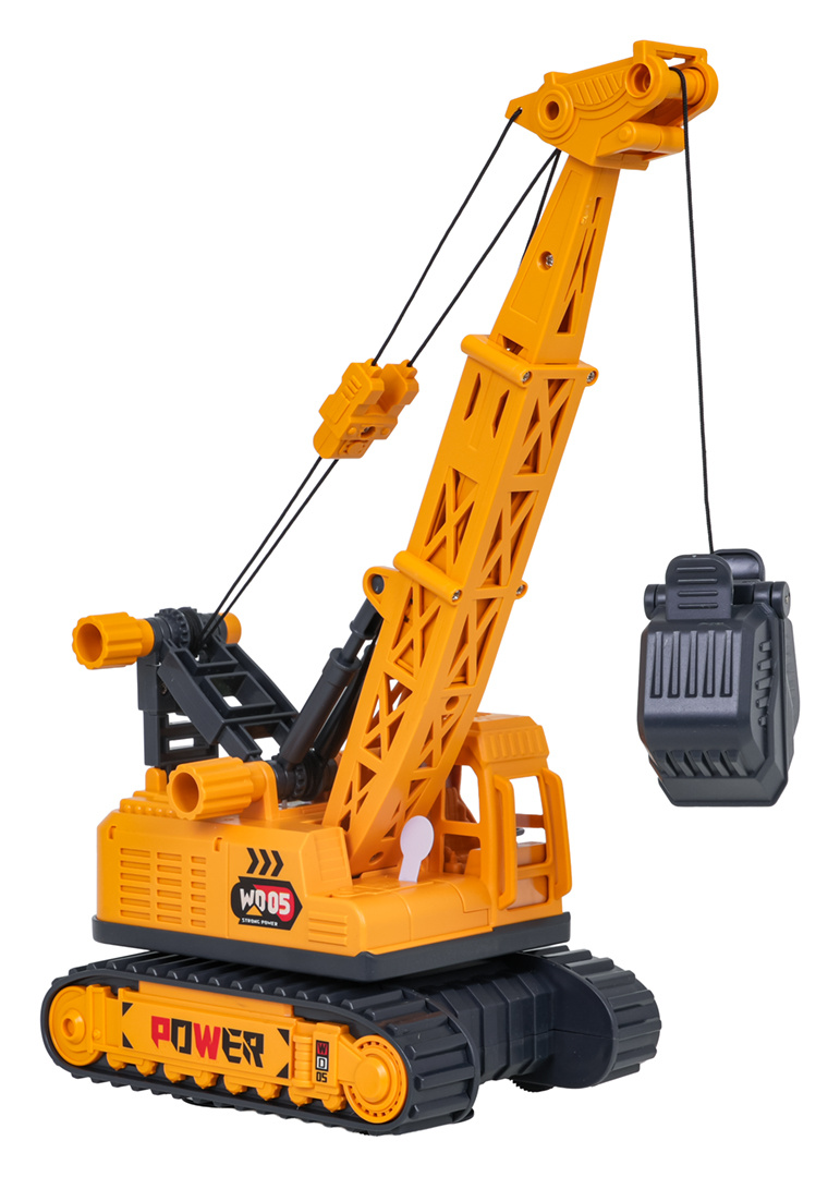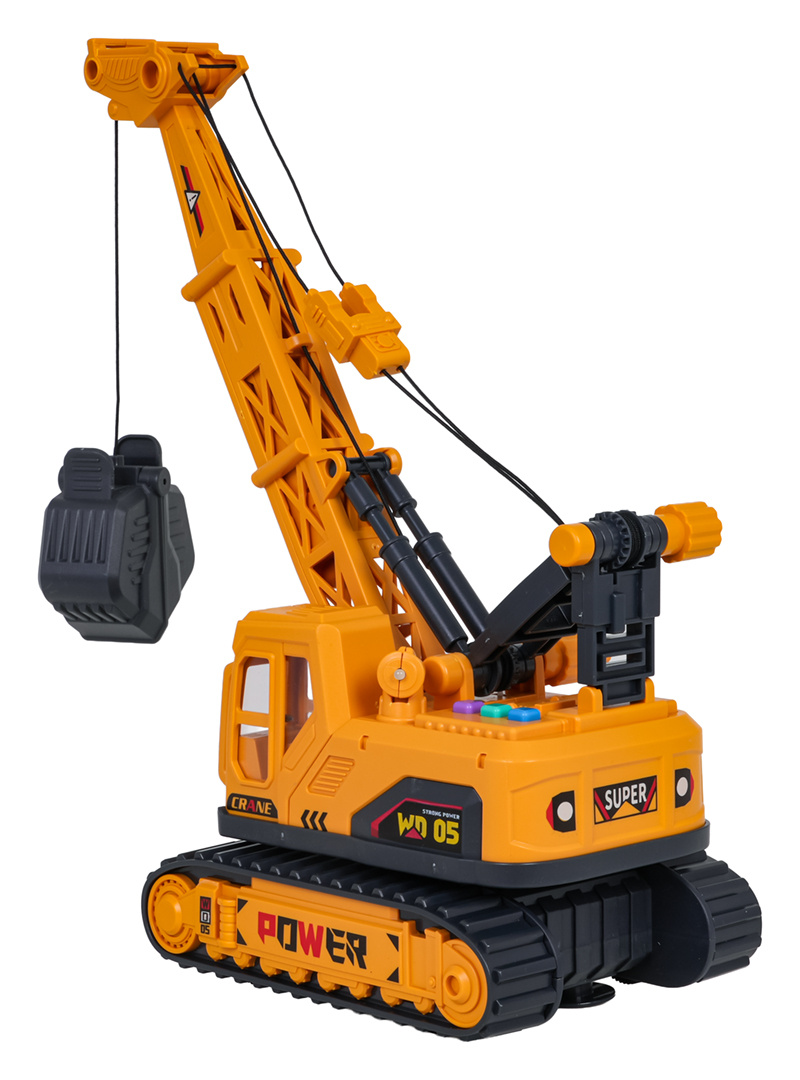 Interaktivní pásový jeřáb, vyrobený v měřítku 1:16, s pohyblivými prvky pro děti od tří let. Hračka byla vyrobena z nejkvalitnějších materiálů s důrazem na detaily. Ručním ovládáním můžeme řídit výložník a spouštět a zvedat uchopovač pro nakládání. Základna stroje se může otáčet o 360 stupňů. Na střeše hračky se nacházejí tlačítka, která spouštějí zvukové a světelné efekty. Na spodní části jeřábu byla umístěna malá kolečka, která mají pohon. Hračka je napájena bateriemi typu 3 x AG13 (v balení).