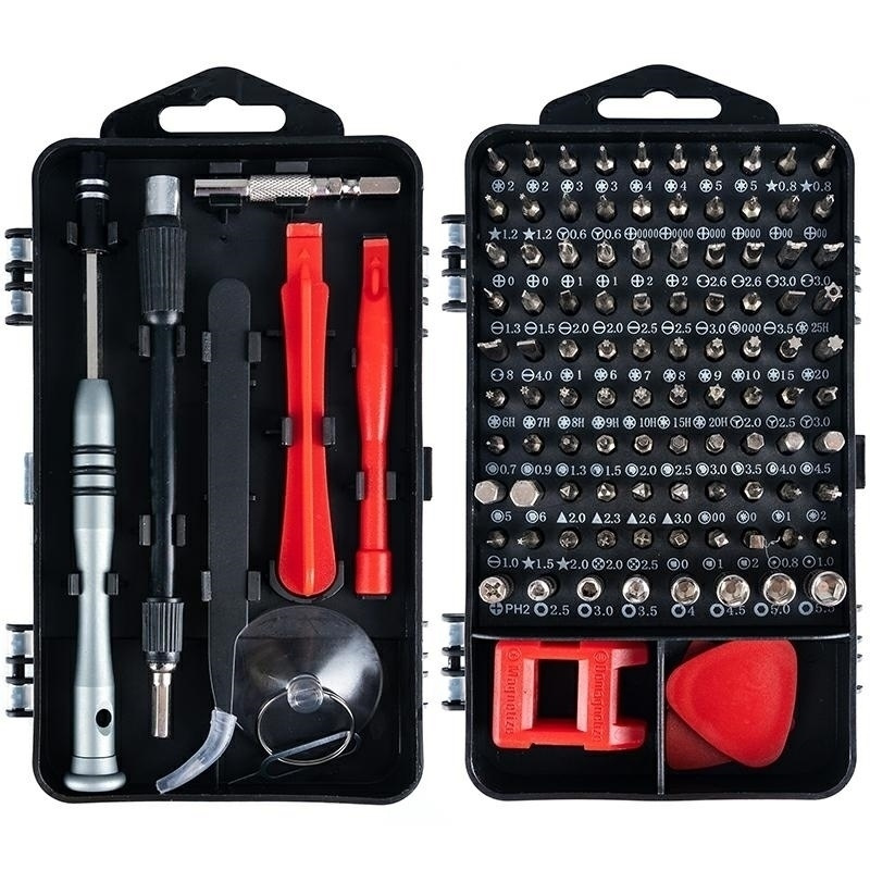 110dílná sada přesných šroubováků a bitů v praktickém pouzdře s možností zavěšení na stěnu. Sada je nezbytná při provádění elektrických oprav, např. telefonů, laptopů atd. Do sady jsou přiloženy m.in. plastové otvíráky/páčidla pro demontáž obrazovek nebo krytů např. mobilních telefonů. V sadě: 2 trojúhelníkové otvíráky/páčidla z odolného plastu 2 páčidla přísavka pro demontáž obrazovek telefonů klíč pro otevírání SIM zásobníků magnetizér/demagnetizér pro nástroje/bity přesné kleště adaptér pro šroubováky flexibilní rameno umožňující odšroubování šroubů na těžko přístupných místech šroubovák prodloužení šroubováku Rozměry pouzdra: 17x10x4,5cm Rozměry balení: 19x11x6cm 98 specializovaných bitů: PH0000 x2, PH000 x2, PH00 x2, PH0 x2, PH1 x2, PH2 x2 SL1.0, SL1.3, SL1.5 x2, SL2.0 x2, SL2.5 x2, SL3.0 x2, SL3.5 x2, SL4.0 x2 torx 6-hranný T1, T2 x2, T3 x2, T4 x2, T5 x2, T6 x2, T7 x2, T8 x2, T9 x2, T10 x2, T15 x2, T20 x2 torx 5-hranný TS0.8 x2, TS1.2 x2, TS1.5, TS2.0 H0.7, H0.9, H1.3, H1.5, H2.0, H2.5, H3.0, H3.5, H4.0 PZ000, PZ00, PZ0, PZ1, PZ2 Y0.6 x2, Y2.0, Y2.5, Y3.0 2.0x2, 2.3, 2.6, 3.0 U2.6x2, U3.0 x2 S0, S1, S2 W2.0, W2.5 0.8, 1.0 PH2.0 M2.5, M3.0, M3.5, M4.0, M4.5, M5.0, M5.5 Sada obsahuje: Bity pro iPhone: 4/4s, 5/5s, 6/6s, 7: PH0000, SL2.0 Bity pro iPhone 8/X: PH0000, SL2.0, Y0.6, W2.5 Bitů pro nejpopulárnější modely se systémem Android: PH0000, SL2.0, Y0.6, T2, T5, T6