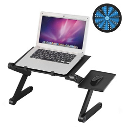 Kovový stolek na notebook s vestavěným chlazením a boční poličkou na myš. Stůl je odolný proti poškrábání a odbarvení. Stolek je postaven na 2 nohách, které se dělí na 3 části - každá s možností nastavení úhlu sklonu, díky čemuž lze snadno a pohodlně nastavit desku podle vlastního uvážení na posteli, pohovce, stole apod. Specifikace: rozměry složeného stolku: 53x26x4cm rozměry desky: 42x26cm rozměry boční police na myš: 18x16cm vestavěný ventilátor o prům. 15cm napájený z USB 5V (délka kabel ok.60 cm) výš. max.: 46 cm Počet ks. na paletě: 180 Produkt zabalený v dodatečné krabici - připravený k odeslání.