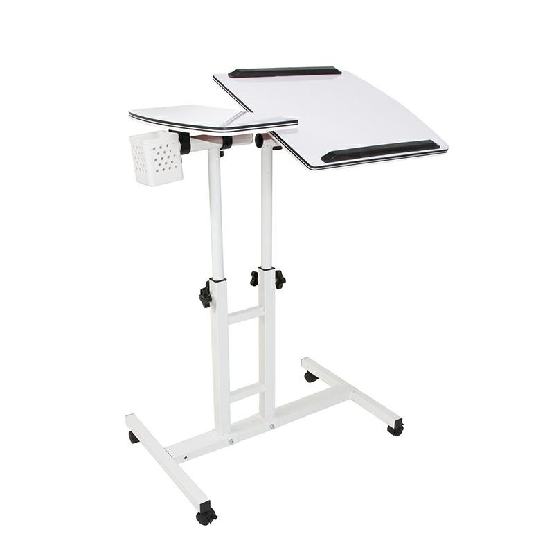 Univerzální stolek na notebook na kolečkách. Má 2 desky s nezávisle nastavitelnou polohou a výškou. Kompaktní rozměry zajišťují, že se skvěle hodí i do nejmenší místnosti. Kolečka mají zámek, který zabraňuje nechtěnému pohybu stolku během používání. Akrylové desky. Zdarma organizér na psací potřeby. Specifikace: - barva: perlově bílá - 2 nezávisle nastavitelné desky - 4 kolečka s blokací - snadná a rychlá montáž - 2 lišty na větší desce zabraňující sklouznutí předmětů (např. laptopu) - boční deska může sloužit např. jako podložka pod myš - rozměry větší desky: 44 x 40 cm - rozměry menší desky: 40 x 20 cm - nastavitelná výška: 60-90 cm - další organizér na psací potřeby - sada pro vlastní montáž - šroubovák v sadě rozměry balení: 66x48x11,5 cm Počet kusů. na paletě: 50