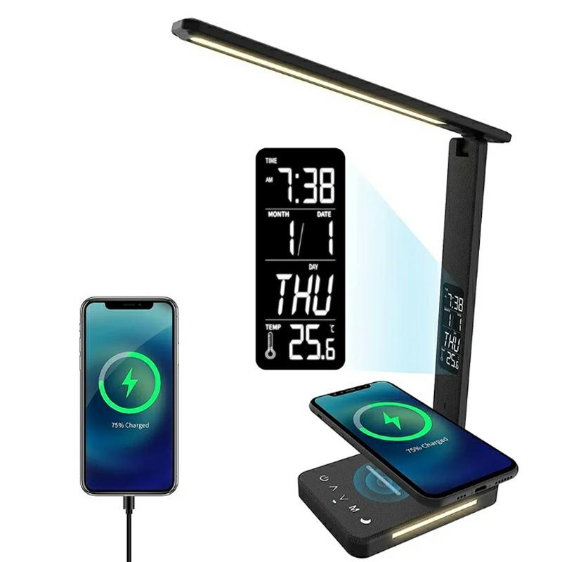 Stolní lampa s bezdrátovou nabíječkou, teploměrem, hodinami, kalendářem a budíkem. Zařízení je energeticky úsporné díky použití LED světelného zdroje. Lampička má nastavitelný úhel sklonu a možnost otáčení, což umožňuje snadno přizpůsobit světlo našim potřebám. Zařízení se ideálně hodí při čtení, psaní úkolů a práci. rozměry balení: 37x14x6cm Specifikace: celkový výkon: 18W bezdrátové nabíjení Qi 10W nabíjení z USB portu (5V 2.1A) noční lampička (3 režimy svícení) budík s funkcí odložení kalendář s dny v týdnu teploměr hodiny, kalendář, teploměr, budík mají záložní napájení pomocí baterie CR2032 (v balení) podsvícení obrazovky napájení lampičky: síťový adaptér: vstup: 100-240V 50/60Hz, výstup: 12V 1.5A délka. napájecí kabel: 145 cm 5 úrovní jasu 5 barev světla světelný tok: 500 lm rozměry: výška./mjr./hl.: 36cm/11,7cm/30,3cm 2 držáky na telefon lampička vyrobená z plastu s texturou kůže