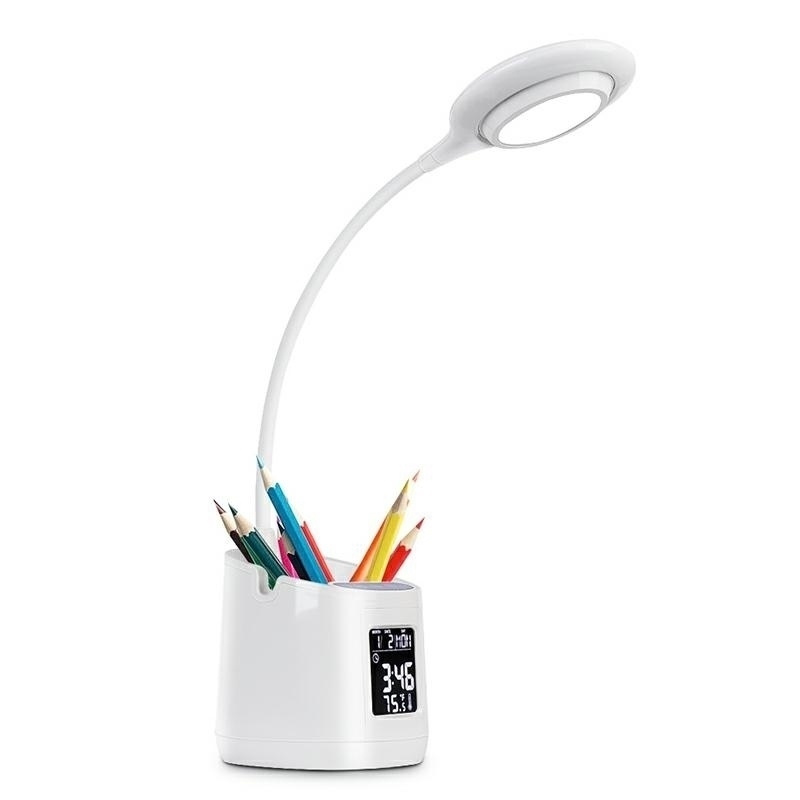 Stolní lampa s teploměrem, hodinami, kalendářem, budíkem a organizérem na kancelářské potřeby. Zařízení je energeticky úsporné díky použití LED světelného zdroje. Lampička má nastavitelný úhel sklonu a možnost otáčení, což umožňuje snadno přizpůsobit světlo našim potřebám. Zařízení se ideálně hodí při čtení, psaní úkolů a práci. V základně se nachází prostorný organizér na psací potřeby. Specifikace: budík s funkcí odložení (8 zvuků alarmu) kalendář s dny v týdnu teploměr lampička napájená akumulátorem 2000mAh organizér na kancelářské potřeby podsvícení obrazovky plynulá regulace jasu 3 barvy světla: teplá, neutrální, studená (3000K, 4500K, 6000K) světelný tok: 380lm rozměry: výš./mjr./hl.: 40cm/9cm/16cm držák na telefon kabel USB pro nabíjení v sadě Rozměry balení: 25x14,5x10cm
