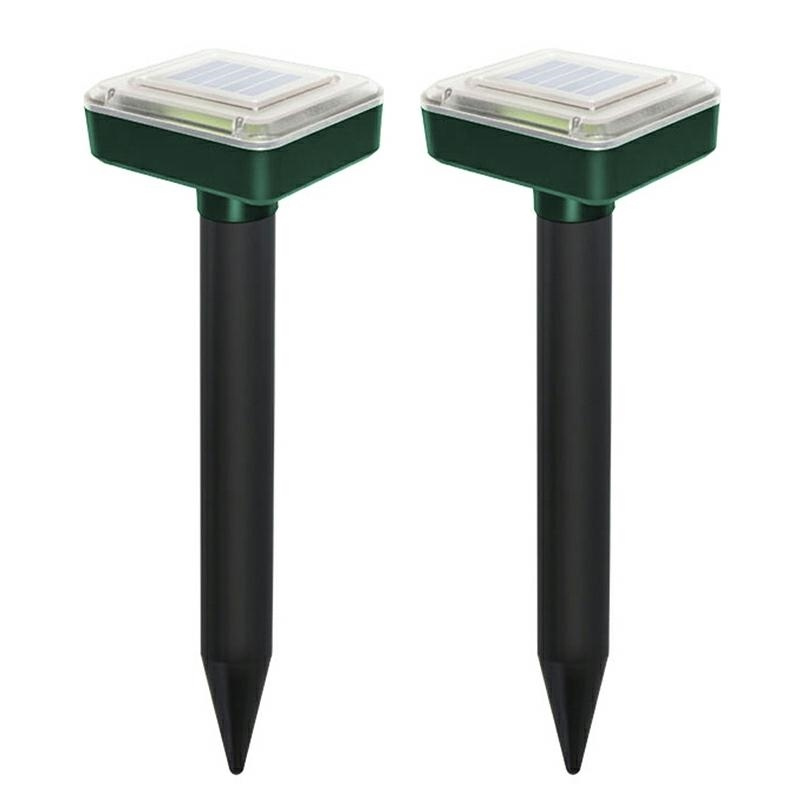 Sada dvou solárních odpuzovačů škůdců - využívají princip vibrací ultrazvukových vln. Odpuzovač vysílá ultrazvukové vlny v rozsahu frekvencí 400 - 1000 Hz, neslyšitelné pro lidi a domácí zvířata. Ultrazvukové vlny v tomto frekvenčním rozsahu dráždí sluchové orgány a nervový systém běžných zahradních škůdců, jako jsou krtci. Každých 20 sekund zařízení vysílá ultrazvukové vlny, které způsobují vibrace v povrchové vrstvě půdy. Vytvářené impulzy tímto způsobem odpuzují škůdce. Vybaven solárním panelem pro přeměnu slunečního světla na energii uloženou ve vestavěné baterii. Umístění zařízení na místech s největším slunečním svitem podmiňuje jeho optimální fungování. Pro dosažení co nejlepších výsledků se doporučuje instalovat odpuzovače ve 20metrových rozestupech. Vlastnosti produktu: - vestavěný akumulátor 1.2V 800mAh nabíjený solárně - solární panel: 3,5x3,5cm - oblast účinného působení cca: 1000m2 - výška: cca. 25 cm - průměr tyče: 27 mm - rozměry horního panelu: 5,8x5,8 cm - materiál: plast - vydávání zvuku + vibrace každých 20 sekund - neškodné pro lidi a zvířata V balení: - 2 solární odpuzovače Produkt zabalený v dalším plastovém obalu - připraven k odeslání. Počet sad na paletě: 800