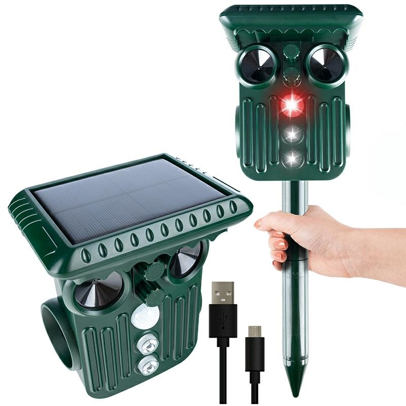 Efektivní odpuzovač zvířat fungující na principu emitování různých frekvencí ultrazvuku a silného LED světla. Vydávané zvuky a světelné záblesky jsou pro zvířata velmi obtěžující, díky čemuž je účinně odrazují, aniž by jim ublížily. Zařízení se zapne, když zvíře vstoupí do dosahu pohybového senzoru, což umožňuje šetřit energii. Specifikace: solární napájení - vestavěný akumulátor 3.7V 2000mAh možnost nabíjení přes port microUSB (kabel v balení) úhel senzoru: 110st. dosah pohybového senzoru: 7-9m (v závislosti na velikosti zvířete) rozměry solárního panelu: 108x82mm rozměry odpuzovače: 17x13,5x10cm výška s montážním kolíkem: 42cm rozměry balení: 15,5x13x14,5cm 5 režimů provozu: -1: 13.5 kHz-19,55 kHz k odstrašování zvířat, jako jsou myši, krysy, psi, lišky, atd. -2: 13,5 kHz-28,8 kHz k odstrašení zvířat, jako jsou kočky, mývalové, jezevci, skunci atd. -3: 400Hz-1000Hz k odstrašení zvířat, jako jsou netopýři, ptáci, hlodavci atd. -4: Silná blikající LED světla k odstrašení zvířat, jako jsou mývalové, divoká prasata, kuny atd. -5: Všechny kombinace se silným blikáním LED. Odpuzovač bude pracovat v pořadí od 1 do 4, měnící frekvenci každých 5 sekund. Produkt zabalený v dalším fóliovém obalu - připravený k odeslání. Množství ks. na paletě: 480