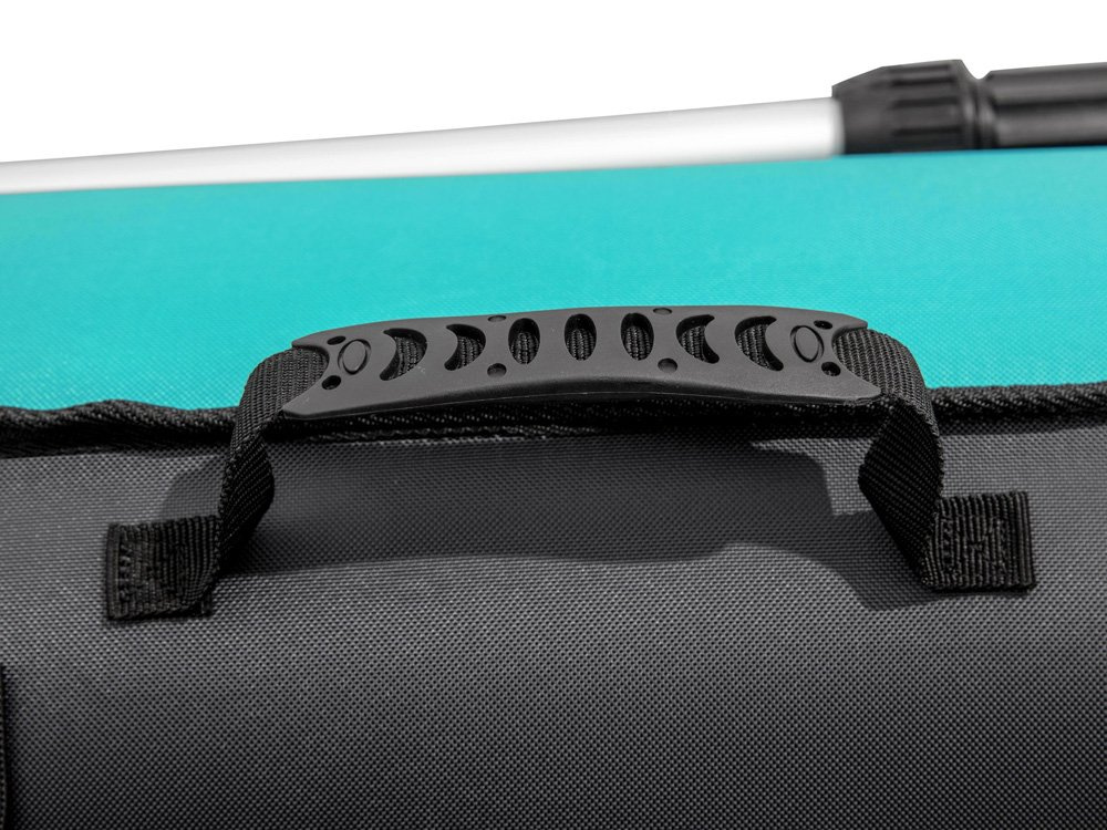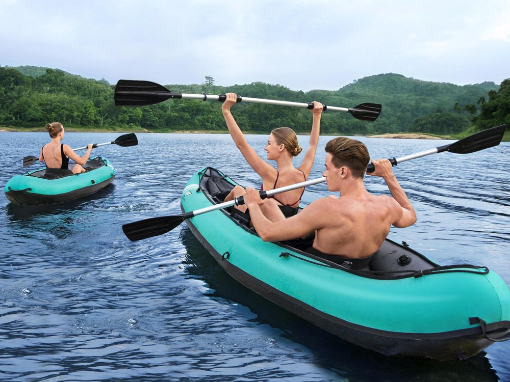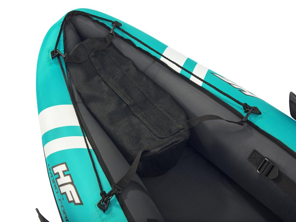 Díky velmi pohodlné, profilované a nastavitelné sedačky je velmi pohodlný. Součástí balení je také velmi praktická odnímatelná palubní taška, 2 kusy 218 cm dlouhých hliníkových pádel se dvěma péry. Trup je potažen speciálním nylonovým povlakem, který je odolný vůči slunečnímu světlu, oleji a mořské vodě. Je také vybaven pístovým čerpadlem, odnímatelnými ploutvemi pro směrovou stabilitu, bezpečnostní ventil a otočné ventily pro rychlé nafouknutí/vyfouknutí. Použití nejkvalitnějších moderních materiálů při výrobě zajistí bezproblémový provoz a díky namontovaným madlům pro přenášení budeme moci kajak snadno přenášet.