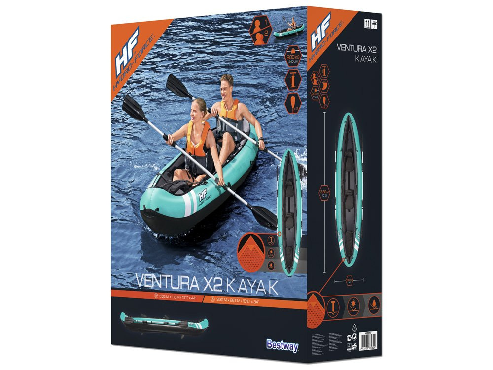 Nejnovější, velmi robustní, extra velký kajak Ventura X2, který byl vytvořen po vzoru vojenských kajaků, si dobře poradí ve stojatých i tekoucích vodách. Bude nepostradatelný při kanoistice na řekách, jezerech nebo jednoduše během letní dovolené u moře. S výtlakem 200 kg mohou kajak úspěšně používat dvě dospělé osoby. Kajak je vyroben z velmi pevného PVC a má pevnou konstrukci, odnímatelnou podlahovou komoru s I-nosníkovou konstrukcí pro zajištění stability.