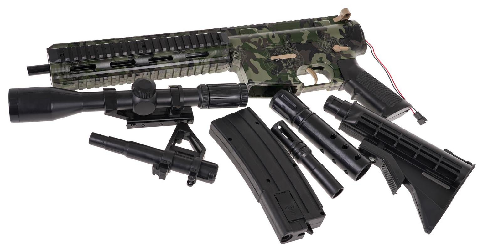 Karabina má režim ručního a automatického střelby. Dalekohled je vybaven zvětšovacím sklem, vzdálenost cíle lze nastavit pomocí otočného knoflíku. V sadě se nacházejí doplňky, jako je hlaveň, tlumič, zásobník, pažba a ochranné brýle. Hračka je napájena akumulátorem 7,4V, který je součástí balení.