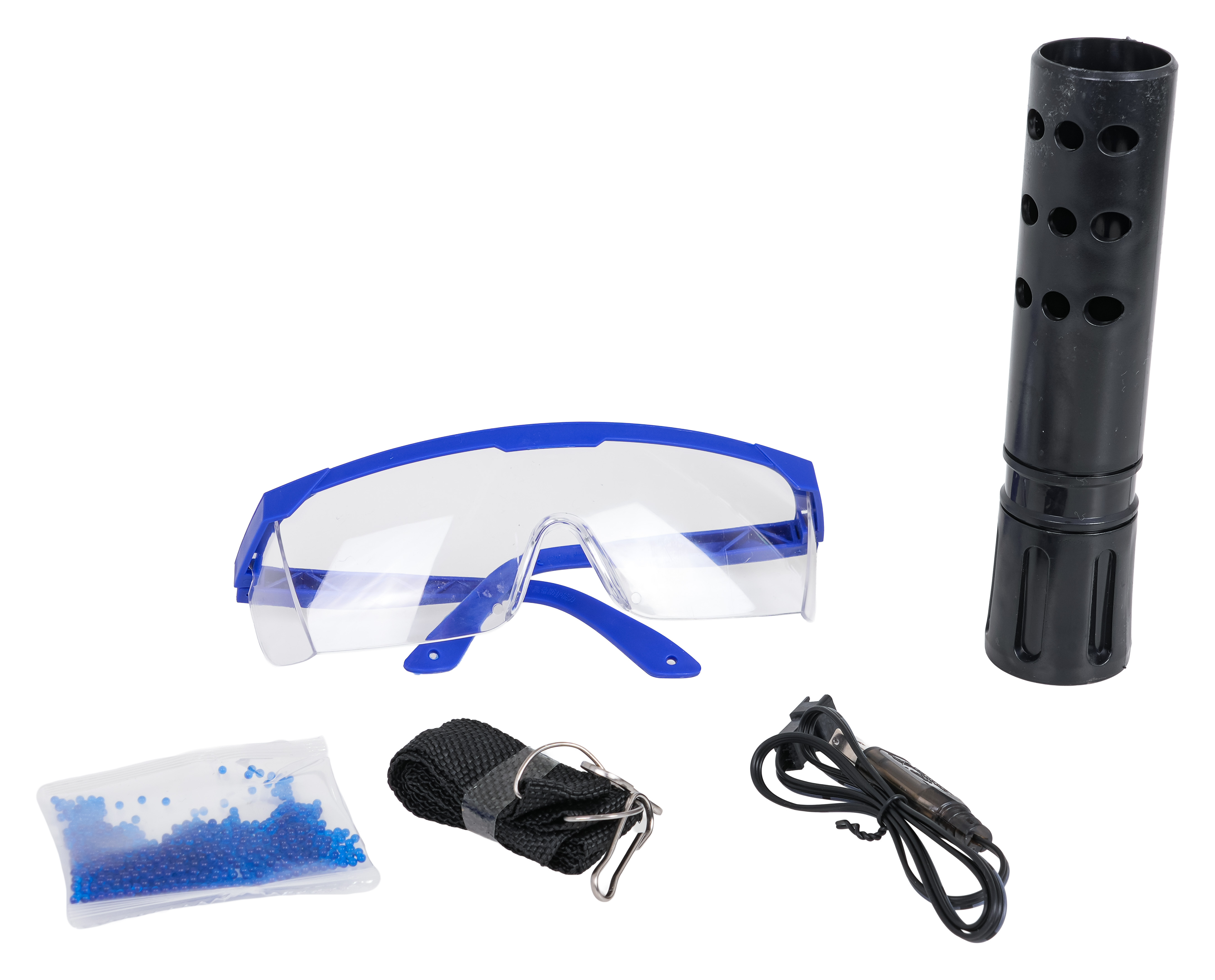 - ochranné brýle, tlumič, zásobník, pásek a sáček s 500 kusy vodních kuliček v sadě.