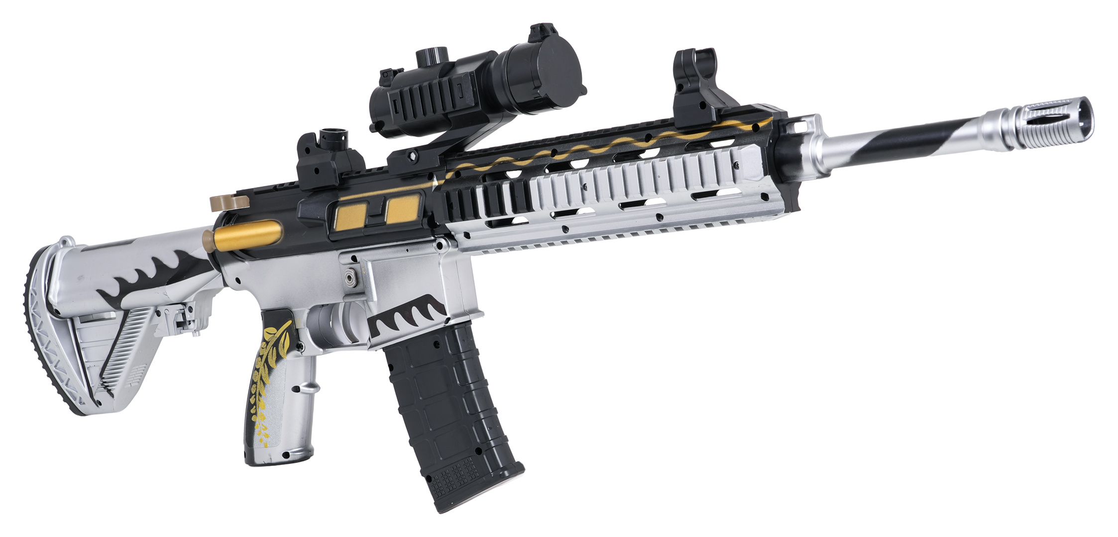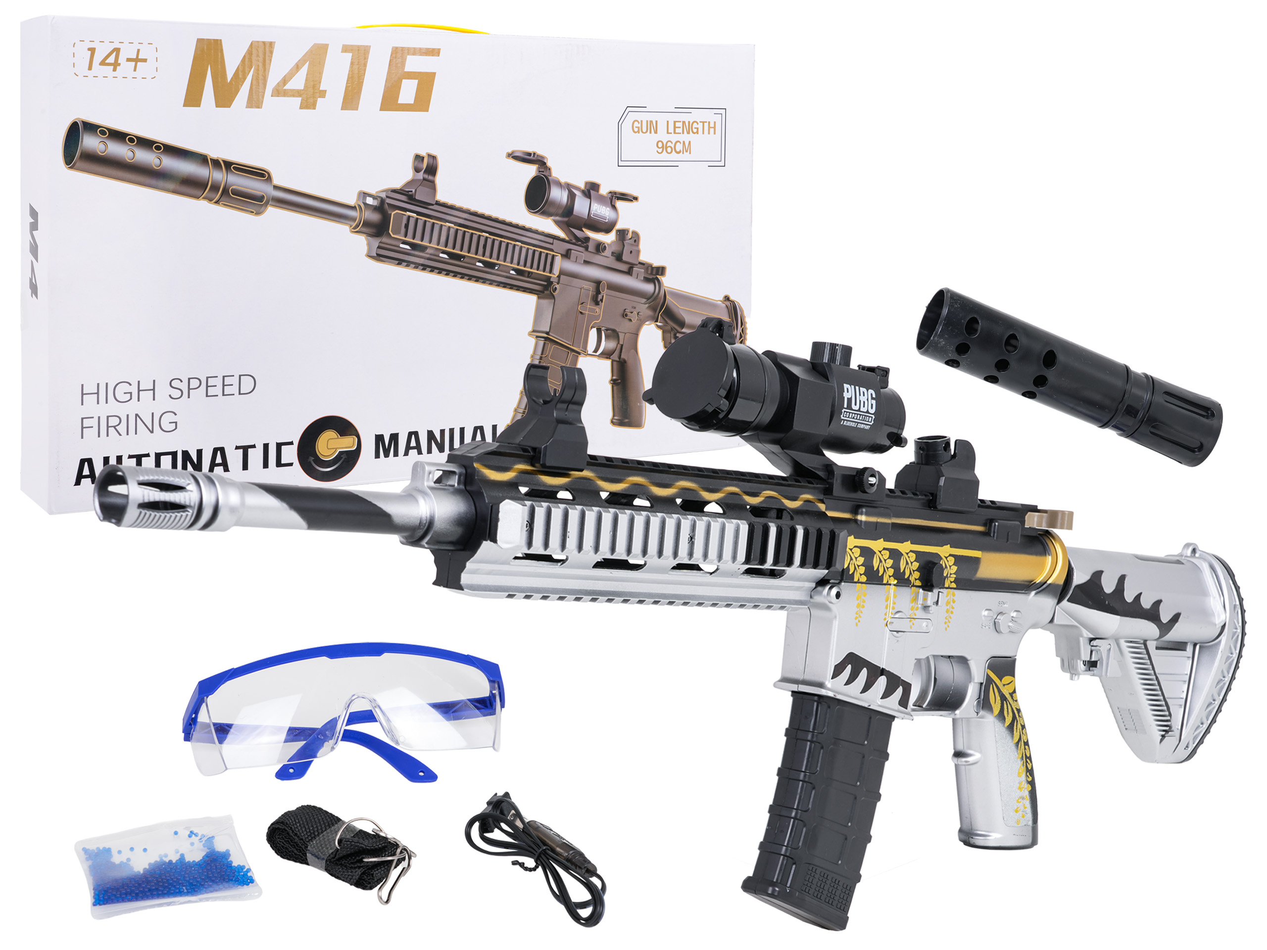 Velká puška M416 na gelové kuličky je určena pro děti od čtrnácti let. Je nutné ho používat se speciálním hydrogelem ve formě kuliček, které po zásahu cíle prasknou. V tomto modelu je třeba používat kuličky o průměru 7-8 mm. Sada obsahuje sáček s nepřipravenými kuličkami. Kuličky se připravují tak, že se zalijí vodou a nechají se odstát přibližně 4-6 hodin, poté se přebytečná voda slije a máme hotové náboje. Karabina má režim manuálního a automatického střelby. Hledí pistole je vybaveno zvětšovacím sklem, můžeme regulovat vzdálenost cíle pomocí knoflíku. Hračka je napájena akumulátorem 7,4V (v balení).