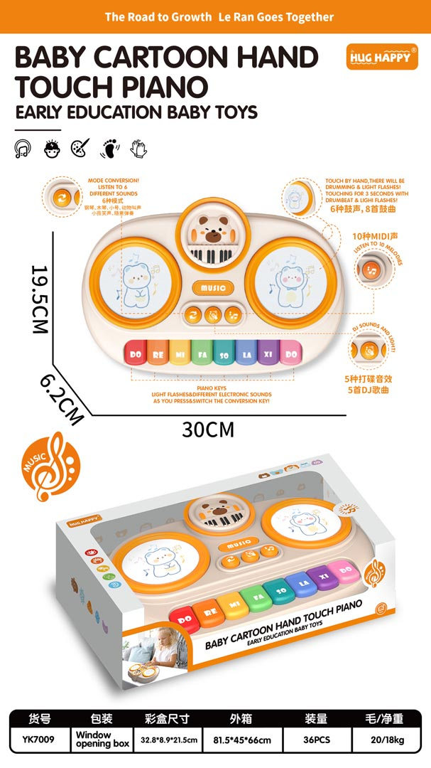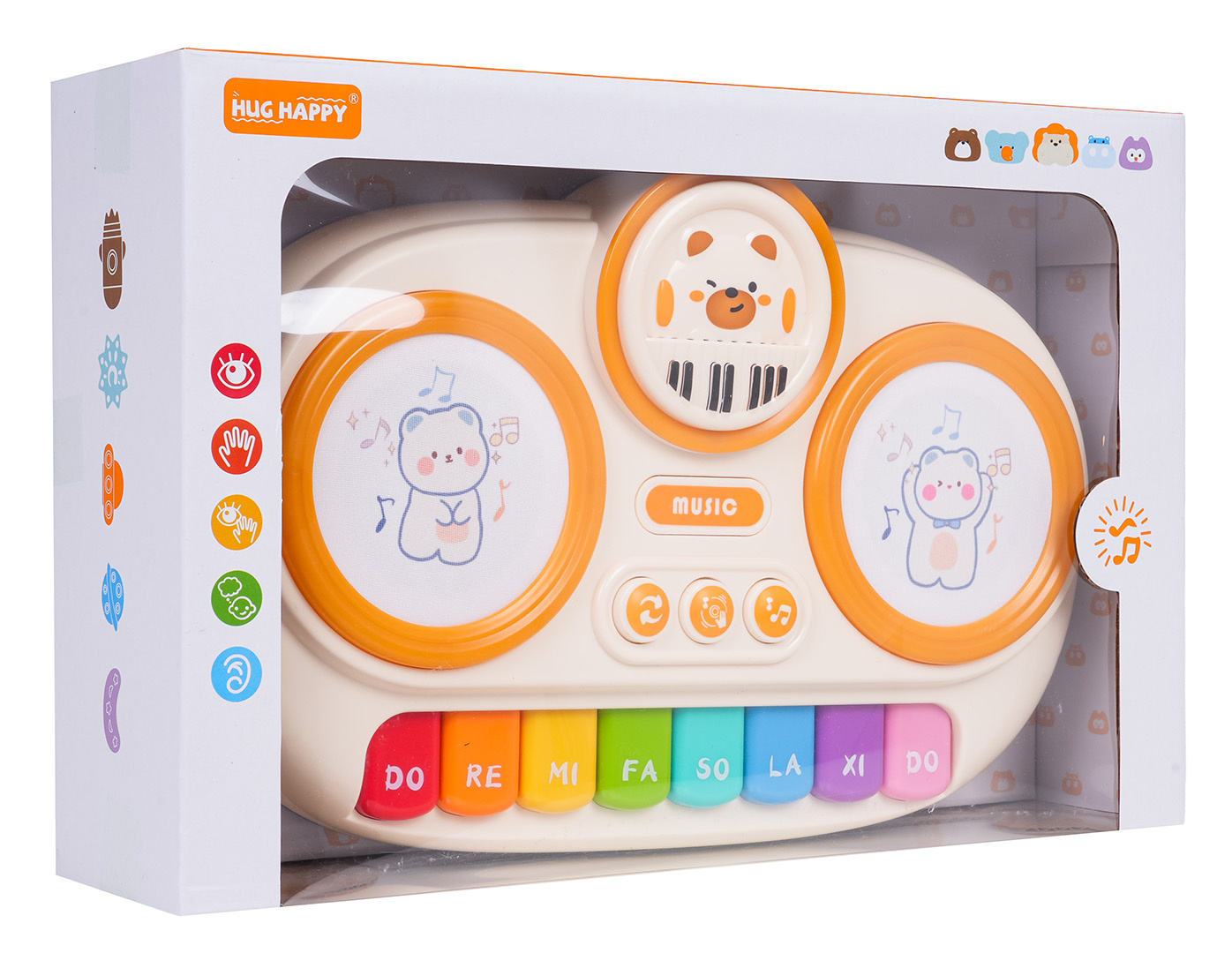 Dotykové interaktivní pianko pro děti od dvanáctého měsíce života. Vyrobeno z odolných a pro děti bezpečných materiálů v živých barvách, které přitahují pozornost a povzbuzují ke hře. Pianinko má změnu režimů, 6 různých zvuků, 10 veselých melodií a DJ režim pro kreativní zábavu se zvukem. Bubny vyrobené z měkkého materiálu svítí a umožňují vyťukávat rytmus ručičkami. Barevné klávesy vydávají různé zvuky v závislosti na zvoleném režimu, od klasických zvuků po zvuky zvířat nebo dětského smíchu. Sada klavírku s bicími nástroji uvede dítě do světa hudby, pomáhá dítěti objevovat zvuky a rytmy. Hračka je napájena hračkami typu 3 x AA 1,5 V (nejsou součástí balení).