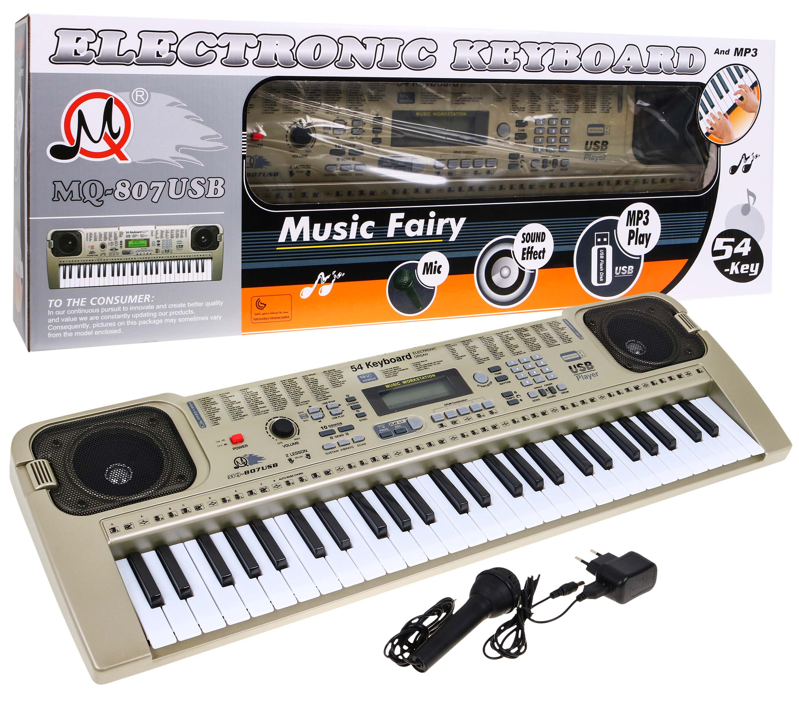 | | - hudební klaviatura, - tlačítko zapnutí/vypnutí - knoflík pro ovládání hlasitosti, - tónové tlačítko - aktivuje 100 různých tónů, - tlačítko rytmu - aktivuje 100 různých rytmů, - start/stop, - tempo, - akordy, - tlačítko synchronizace, - tlačítko podržení, - tlačítko vibrato, - tlačítko echo, - skupina tlačítek, pod kterými se skrývají různé typy bicích, - tlačítko perkusí, - tlačítko nahrávání, - programovací tlačítko, - tlačítko přehrávání, - tlačítko lekce, - tlačítko skladby, - tlačítka demo A a demo B (skrývající 10 různých demo verzí), - tlačítka USB stand a USB play, - tlačítka USB pro ovládání hlasitosti, - digitální displej, - mikrofon, - napájení, - 2 reproduktory. |