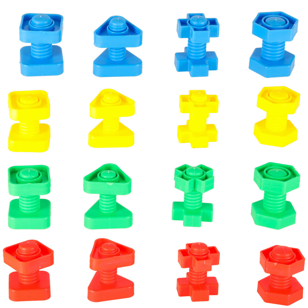Vícedílné bloky ve tvaru šroubu.Vynikající vzdělávací hračka v nádherných barvách, která přinese spoustu radosti a zábavy.Sada obsahuje 30 součástí:15 šroubů, 15 matic.Výška šroubu: cca 5,5 cm.Průměr dna šroubu: 1,5-2 cm