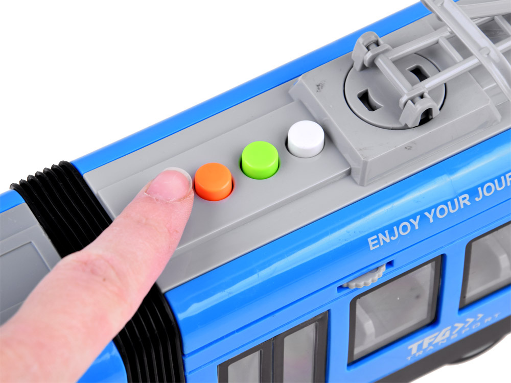 Tramvaj je hračka se zvukovými a světelnými efekty. vozidlo má otevírací dveře a realistické zvuky, jak se sluší a patří. Hra s modrou kloubovou tramvají bude mega autentická a zábavná. Tramvaj je vyrobena z plastu v modrošedé barvě. Vozidlo se pohybuje díky napnutí pružin v kolech.