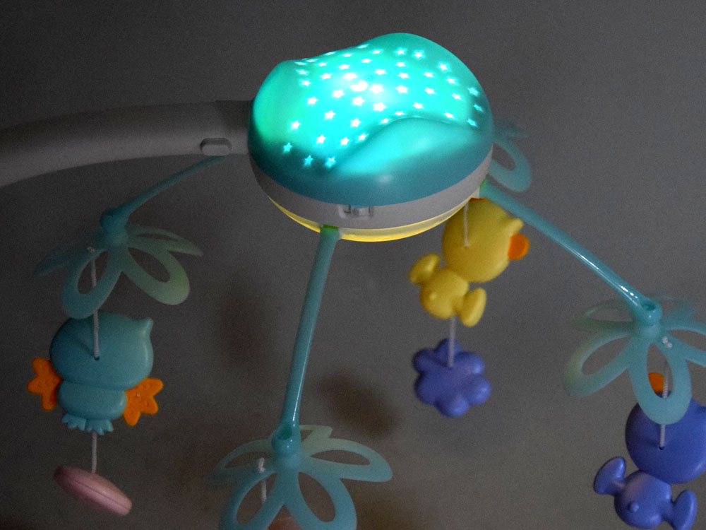 Vhodné na noc, když se dítě bojí usnout, nebo jen tak, abyste na něj dohlédli - projektor se světlem svítí, hraje tichá hudba a kolotoč se otáčí.