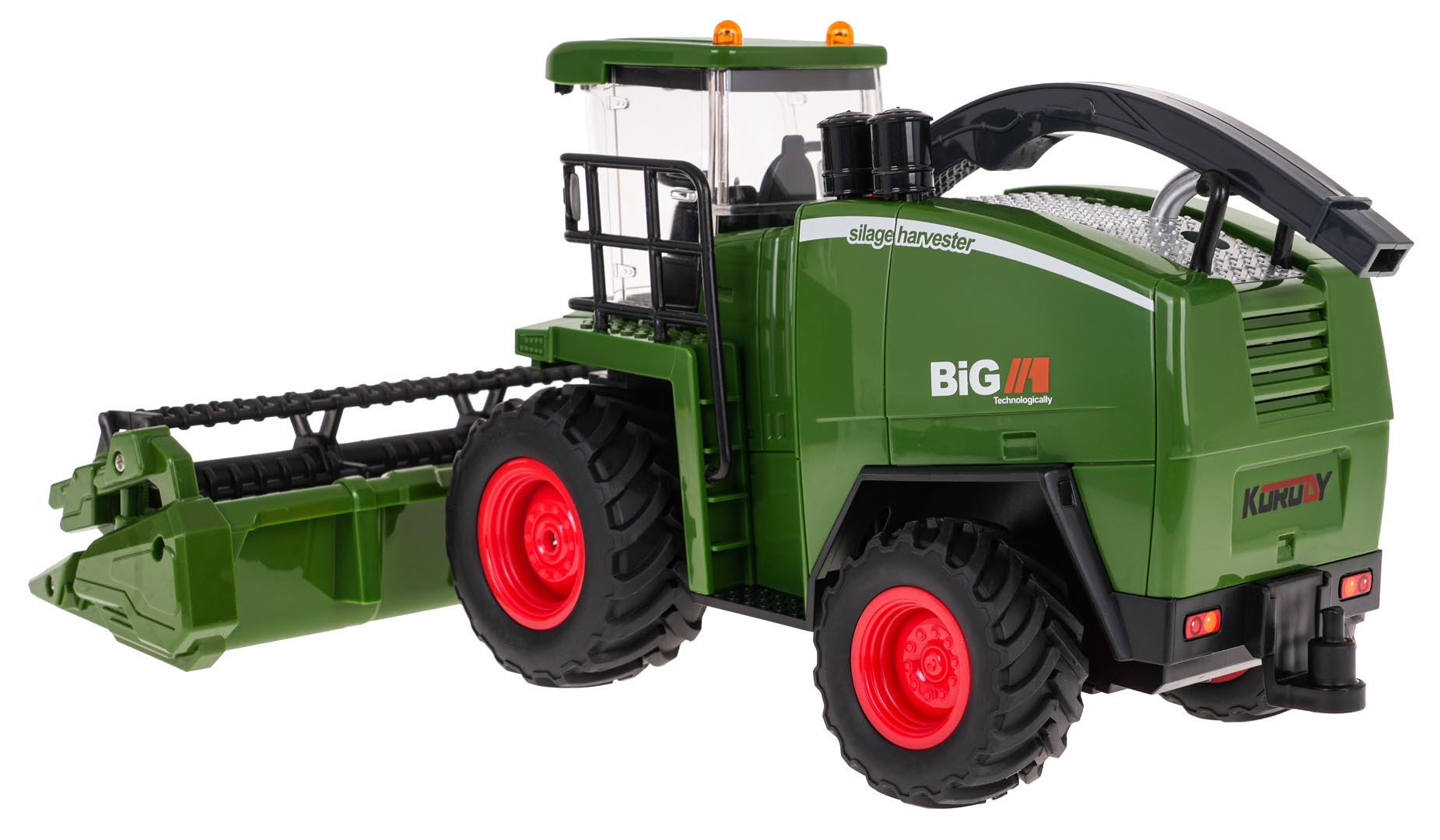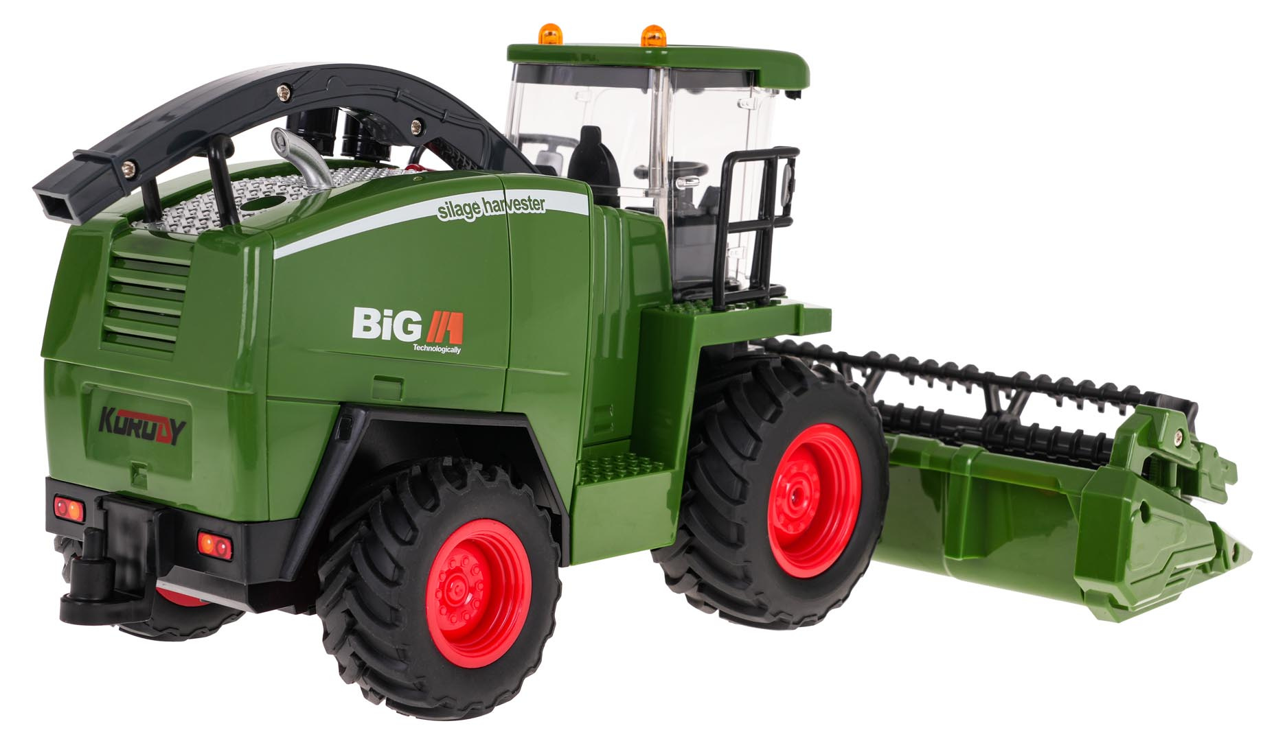 Dálkově ovládaný kombajn 2v1 s efekty zvuku, světla a kouře pro děti od 3 let. Vozidlo bylo vyrobeno z nejkvalitnějšího plastu v živých barvách, je velmi věrně zpracováno podle skutečného stroje. Stroj vydává zvuky a má osvětlení (přední část kabiny a střecha kabiny). Plnicí trubici můžeme otáčet a řezné kotouče se otáčejí během jízdy. V sadě se nachází žací lišta na obilí a žací lišta na kukuřici, které můžeme používat zaměnitelně. Kombajn má gumové pneumatiky, které mu zajišťují dobrou přilnavost k povrchu. Hračka je napájena akumulátorem typu 3,7 V 500 mAh (v balení), ovladač bateriemi 2 x AAA 1,5 V (nejsou součástí balení).