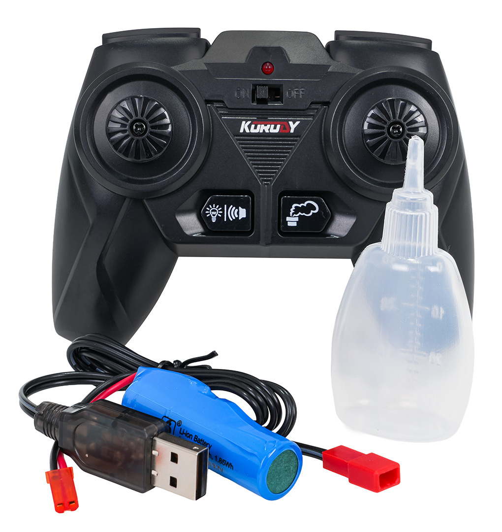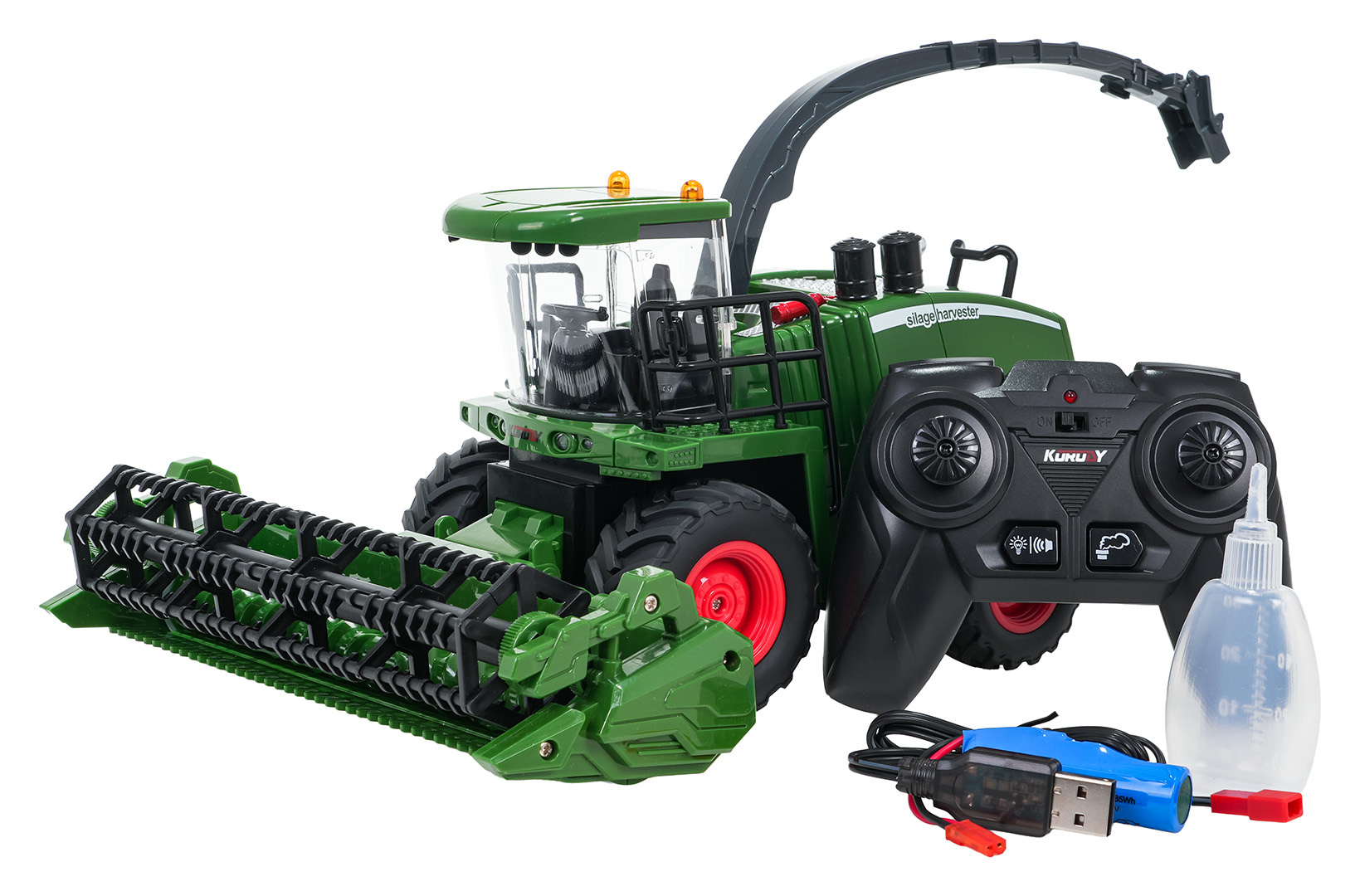 Dálkově ovládaný kombajn, vyrobený v měřítku 1:24, pro děti od tří let. Kombajn se pohybuje ve všech směrech, dopředu, dozadu, doprava a doleva, na velkých gumových kolech, které mu zajišťují dobrou přilnavost k povrchu. Přední buben řezacího mechanismu se otáčí. Rouru výsypu můžeme otáčet o 360 stupňů. Kombajn má LED osvětlení, nahoře a vpředu vozidla, s možností vypnutí pomocí dálkového ovladače. Realistické zvuky práce stroje, zvuk práce motoru, signál couvání, můžeme zapínat a vypínat pomocí dálkového ovladače. Další výhodou tohoto modelu je nádrž na vodu, která po naplnění a stisknutí tlačítka pára (na dálkovém ovladači) produkuje vodní páru, simulující kouř z výfuku. Hračka má demo režim, ve kterém představuje všechny své možnosti. Po delší nečinnosti se vozidlo vypne, aby šetřilo spotřebu baterie. Hračka je napájena akumulátorem typu 3,7V, ovladač bateriemi typu 2 x AAA 1,5V (nejsou součástí balení)