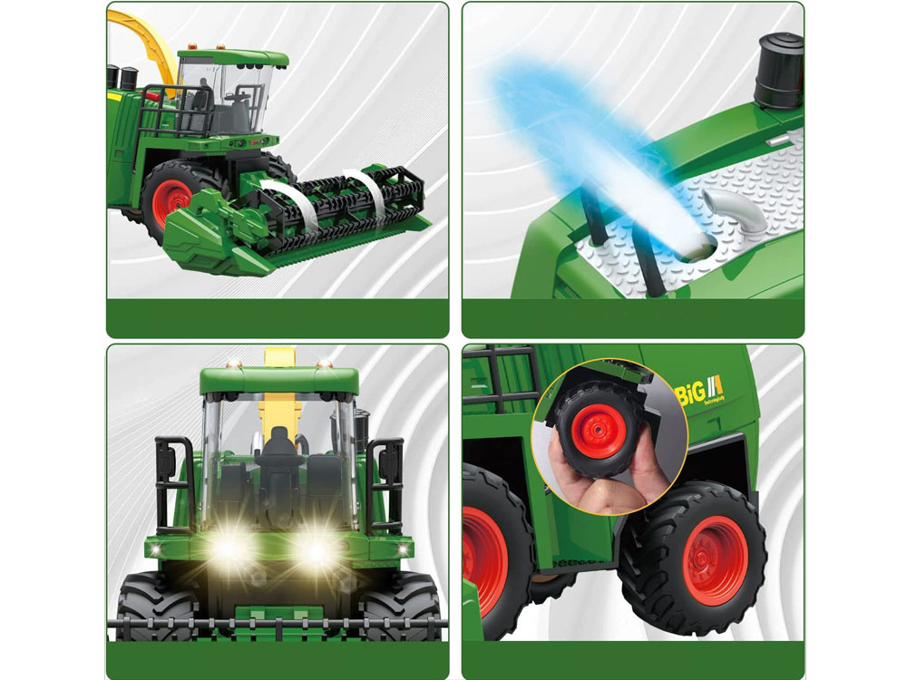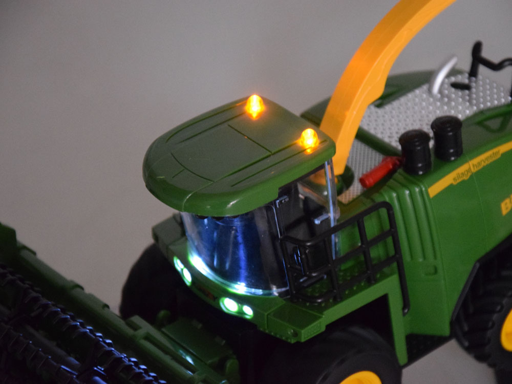 Po nastartování kombajnu se ozve zvuk startování a motor běží na pomalý převodový stupeň. Při jízdě vpřed je slyšet chod motoru a svítí přední světla a střešní signalizační světla. Při změně směru jízdy vzad se ozve zvuk couvání a světla začnou blikat. Světelné a zvukové efekty lze vypnout příslušným tlačítkem na dálkovém ovladači.