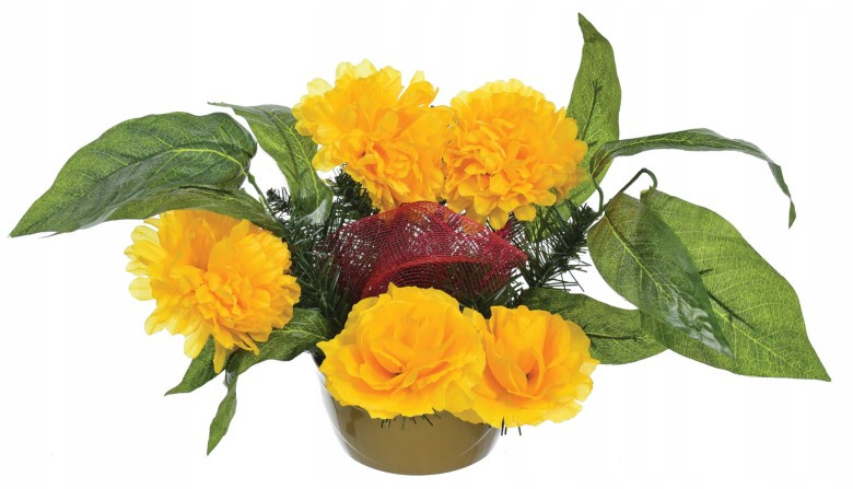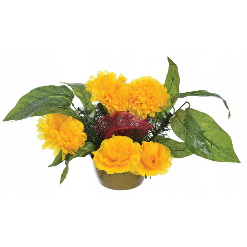 Kompozice provedená solidně na ozdobném květináči vyplněném zátěžovým materiálem. Dekorace ozdobená 2 umělými květinami, doplněná mašlí a větvičkami umělého vánočního stromku, se neobyčejně krásně a elegantně prezentuje na náhrobním pomníku.