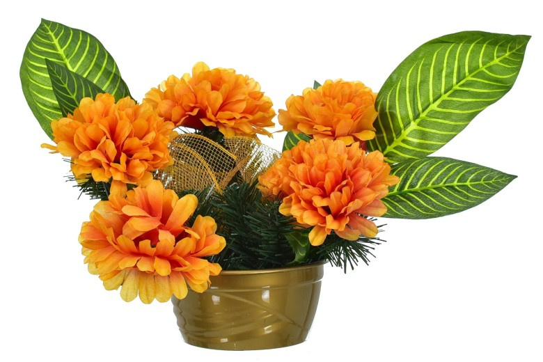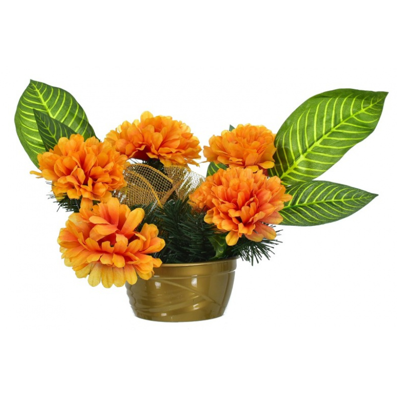 STROIK NA HROBU KW-903036 Krásná náhrobní kompozice pevně vyrobená na ozdobném květináči vyplněném zatíženým materiálem. Čelenka zdobená 5 umělými květinami a další mašlí z umělých větviček vánočního stromku