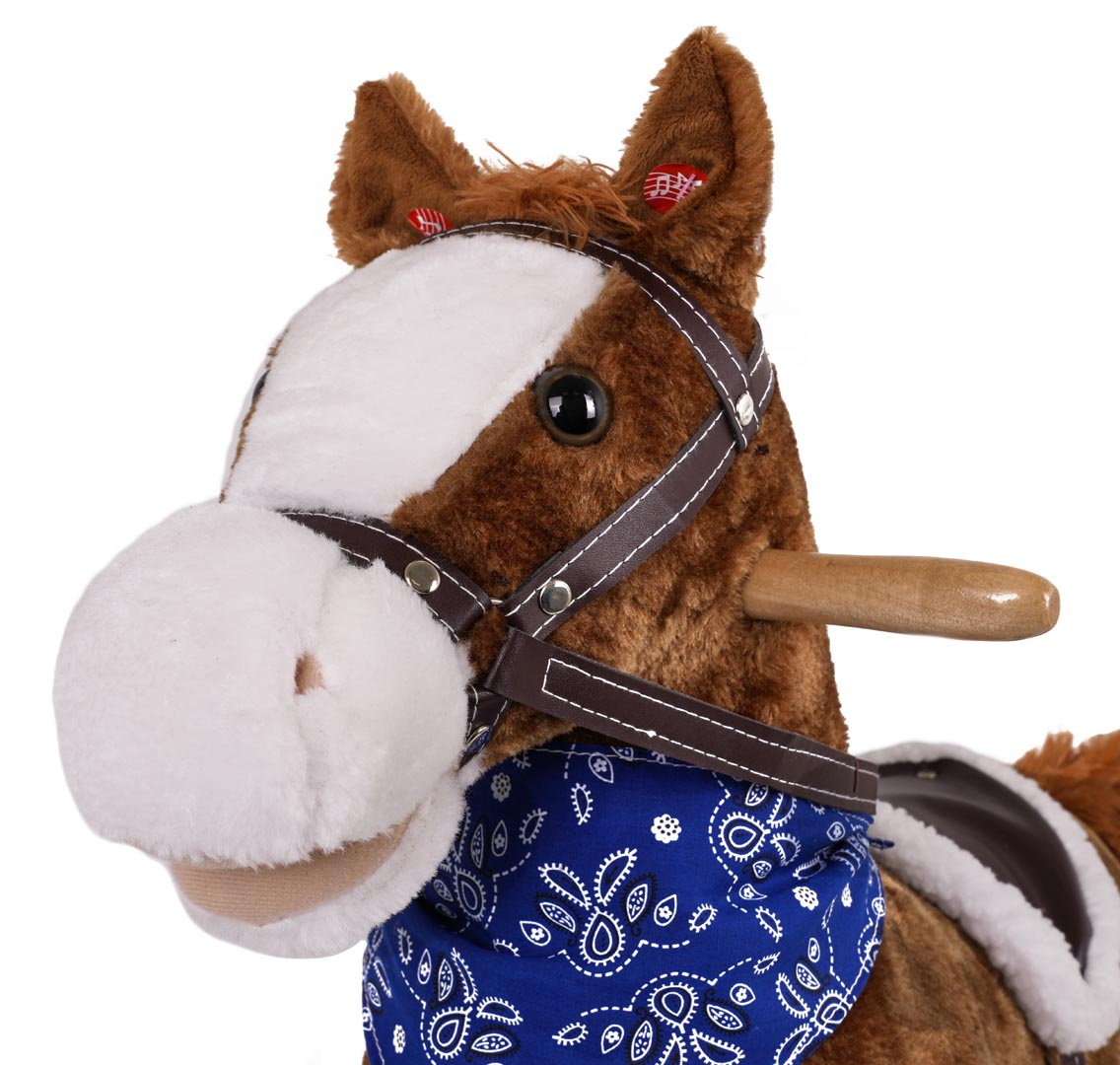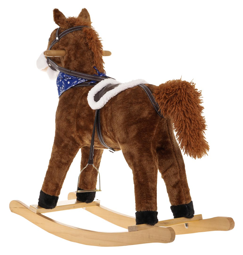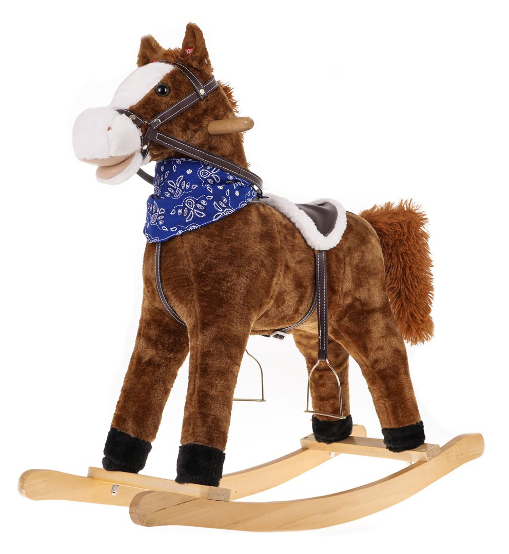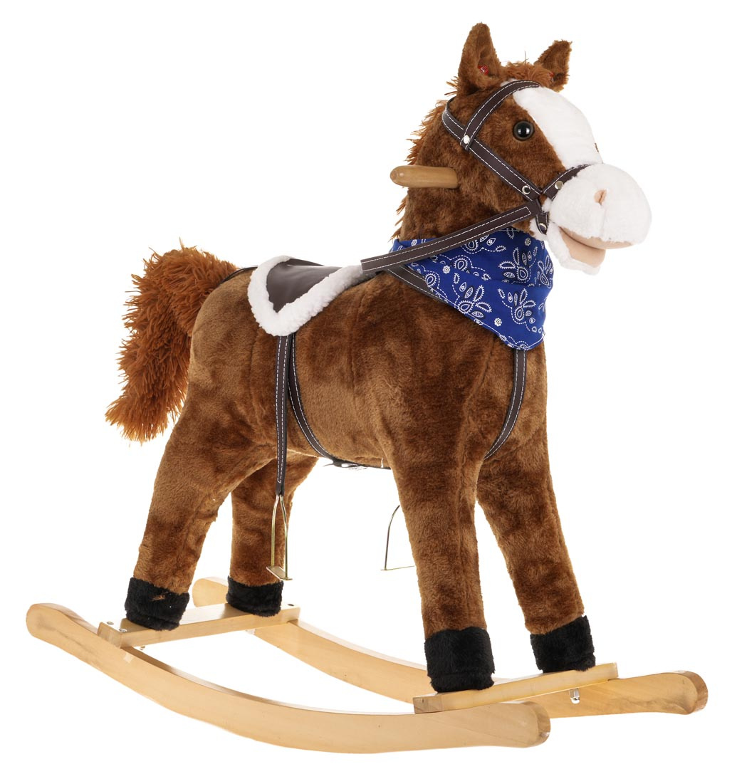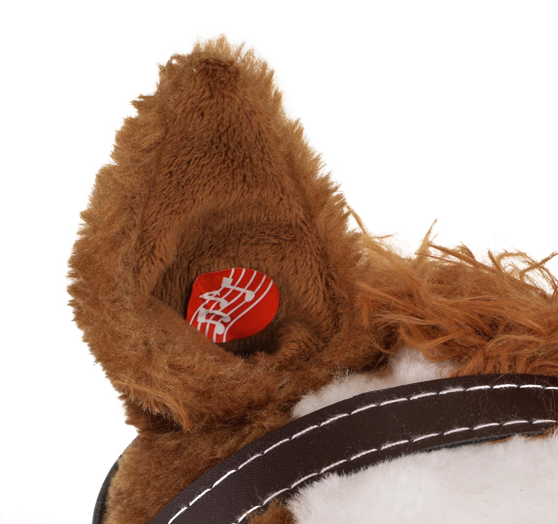 Plyšový houpací koník se zvukovými efekty pro děti od 3 let.Kůň se jistě zalíbí každému malému dítěti. Je měkoučký na dotek, má sedlo z ekokůže se třmeny, otěže a šátek na krku. Na pravém a levém uchu koně se nacházejí senzory, které spouštějí zvuky řehtání a cvalu, pohybují ocasem a tlamou. Hračka je napájena bateriemi typu 3 x AA 1,5V, baterie nejsou součástí balení.