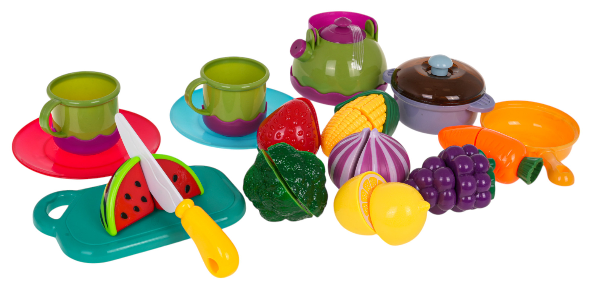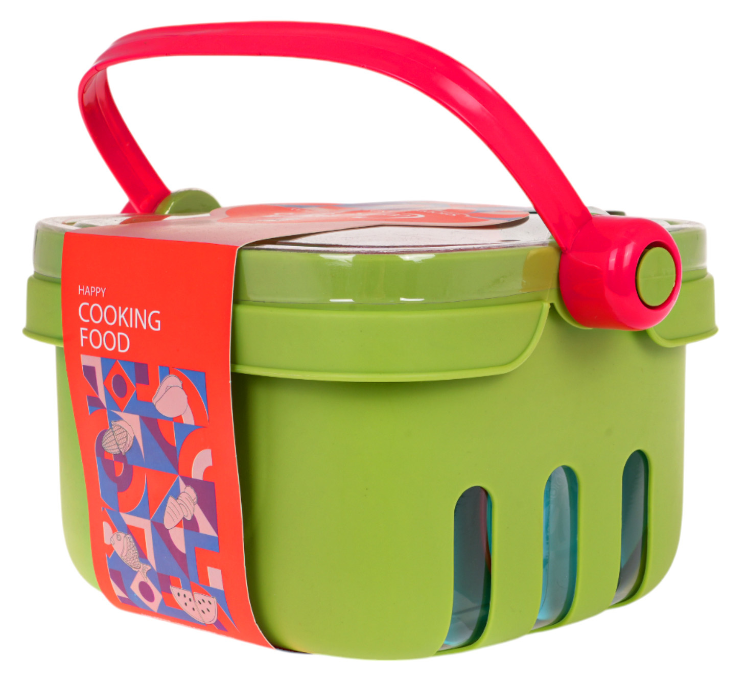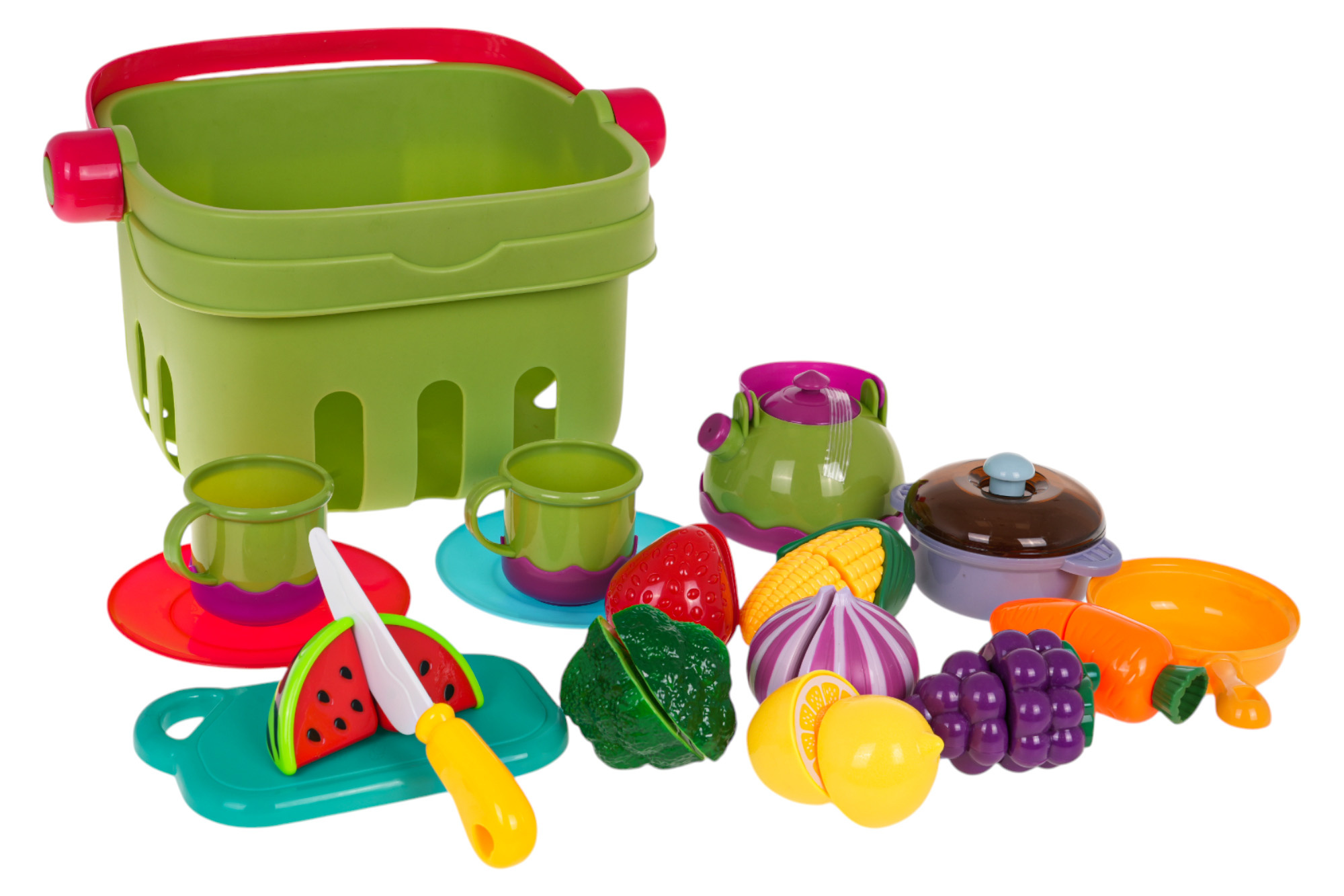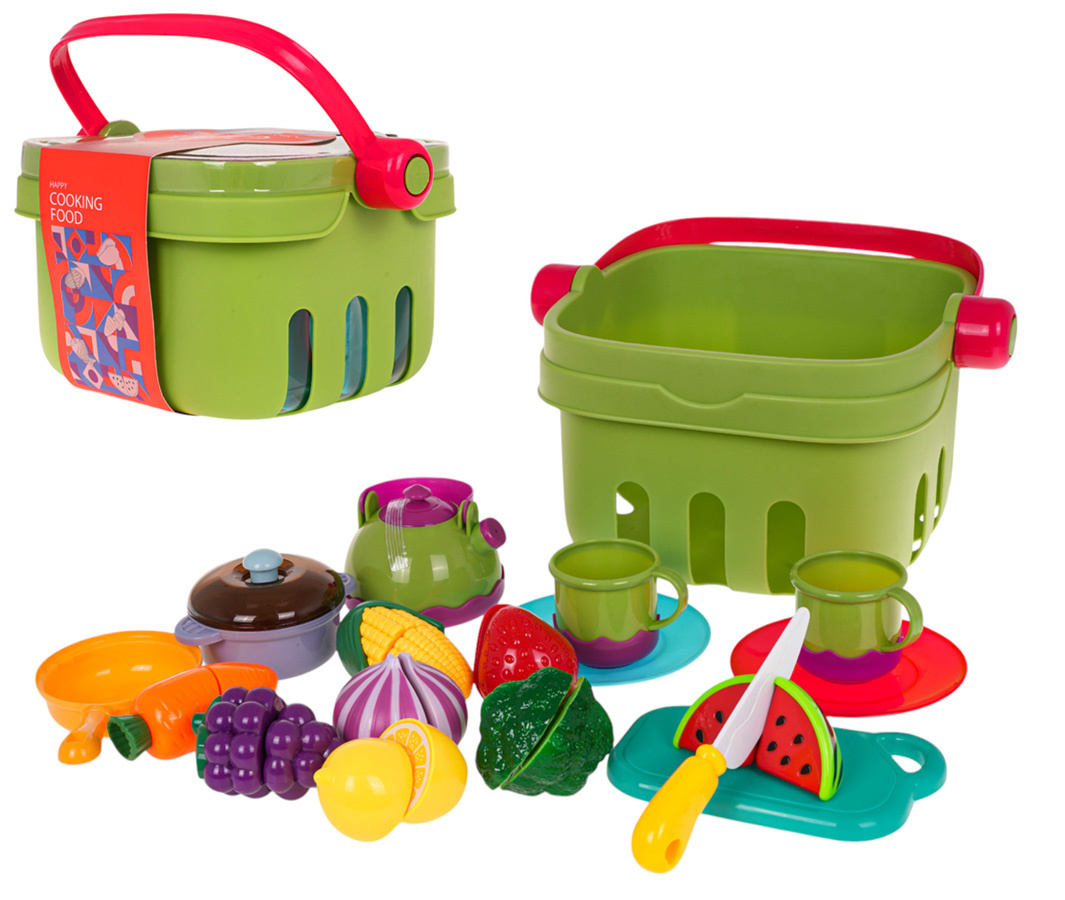 Košík s doplňky pro děti od 3 let. V sadě se nachází piknikový koš, hrnec s pokličkou, prkénko na krájení zeleniny a ovoce, nůž, pánev, talířky, hrnky a atrapy zeleniny a ovoce na suchý zip. Ideální způsob, jak se bavit venku.