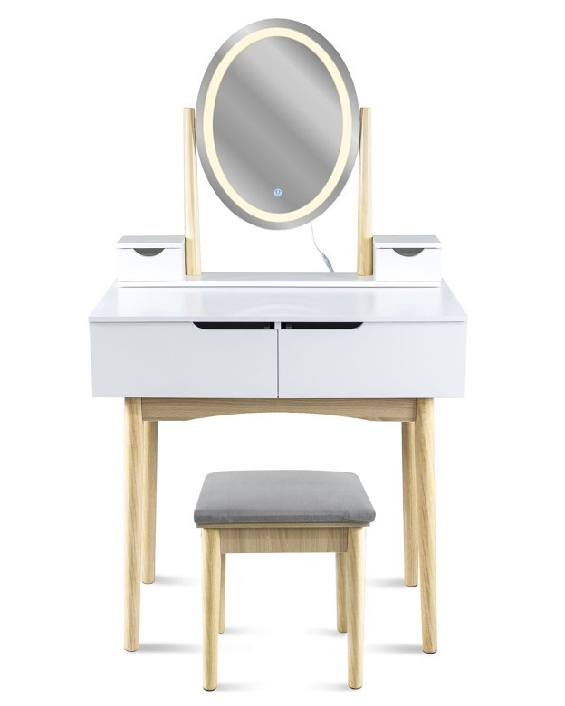 TOALETA se zrcadlem LED Představujeme vám elegantní model krásného toaletního stolku v nejmodernější bílé barvě. Tento kus nábytku je ideální do ložnice jako praktické místo pro líčení, kadeřnictví, každodenní péči o krásu, ale i pro psaní dopisů nebo ukládání různých drobností. barva: bílá / světlý buk Barva čalounění taburetu: šedá Povrchová úprava: matná Počet zásuvek: 4 kusy Nábytek k vlastní montáži. OPTIMÁLNÍ A PRAKTICKÉ POUŽITÍ zásuvky, ideální na kosmetiku, šperky, účtenky, psací potřeby a další drobnosti, které budou mít konečně své místo zrcadlo s LED osvětlením (dvě barvy světla), takže si můžete detailně prohlédnout svůj účes a make-up ze všech stran a z různých úhlů světla pracovní plocha, která vám umožní používat toaletní stolek také jako psací stůl, praktický prostor pro vložení stoličky, odpovídající celku