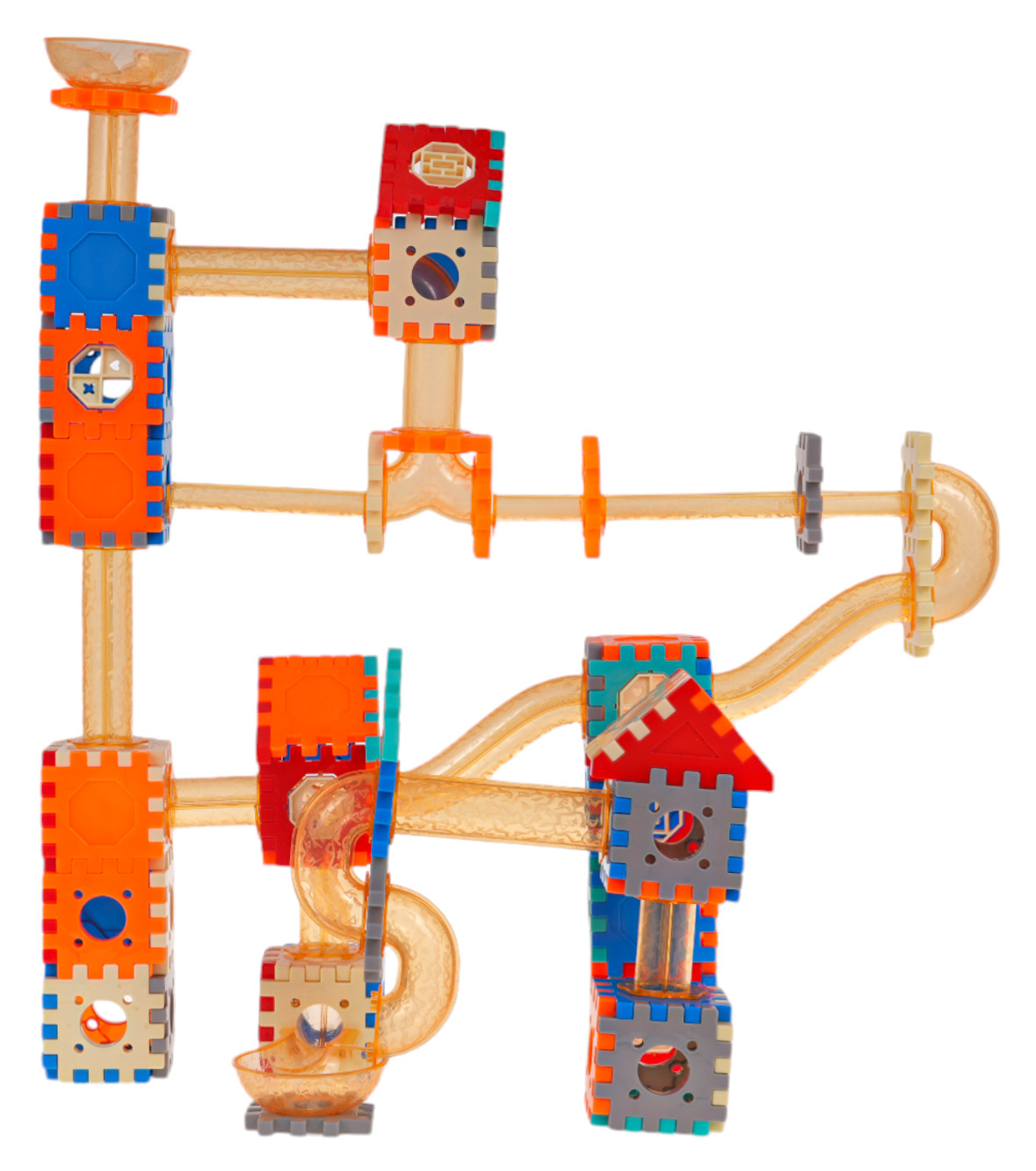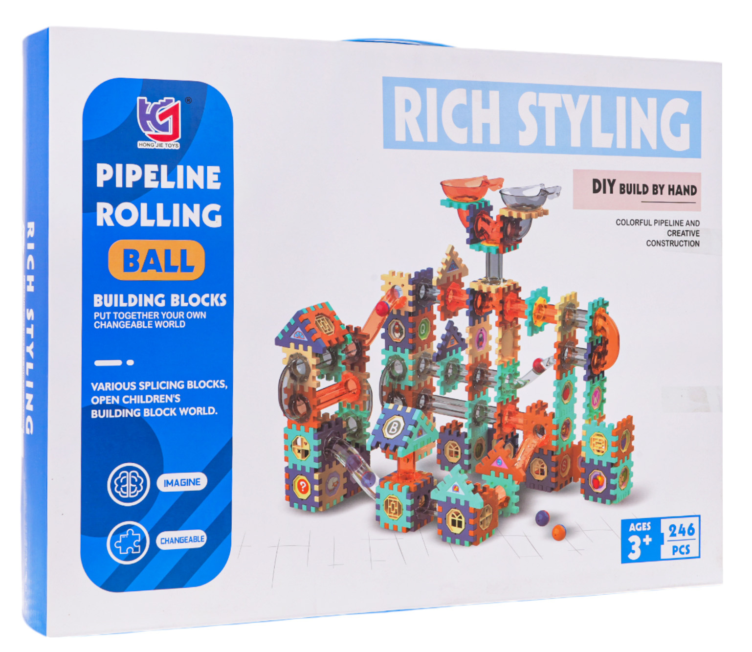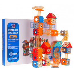 Obrovská sada kostek s úchyty, dráhou a míčkem pro děti od 3 let. Sada se skládá z 246 prvků, ze kterých můžeme postavit konstrukci dráhy pro míček. V návodu se nachází příkladová konstrukce, ale dítě může také vytvořit stavby podle vlastního nápadu, což rozvíjí kreativitu a logické myšlení. Sada je vyrobena z nejkvalitnějšího plastu v živých barvách, které přitahují pozornost dítěte. Na kostky s výstupky můžeme nalepit barevné obrázky. Úchyty dobře drží a celá konstrukce je mimořádně stabilní. Po postavení konstrukce je třeba vložit míček do horních trychtýřů a ten se pak vydá dolů, překonávajíc četné zatáčky. Pozorování kutálejícího se míčku je nesmírně uklidňující a relaxační.