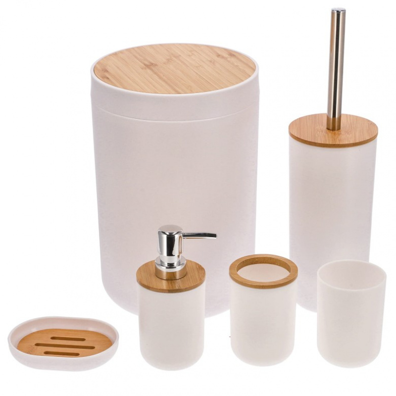 Sada obsahuje: koš na odpadky kelímek na zubní kartáčky kelímek na mýdlo nádobku na tekuté mýdlo kartáč na WC