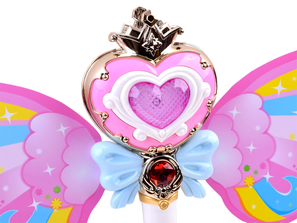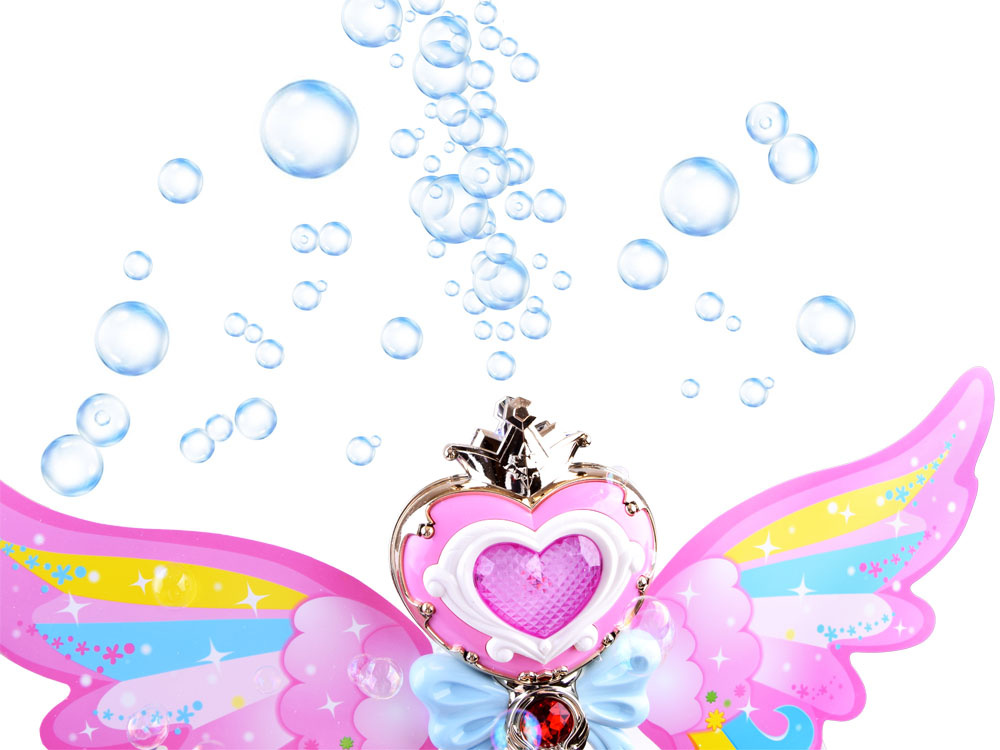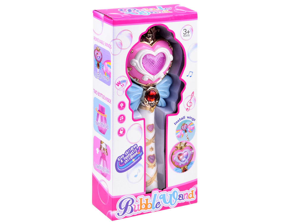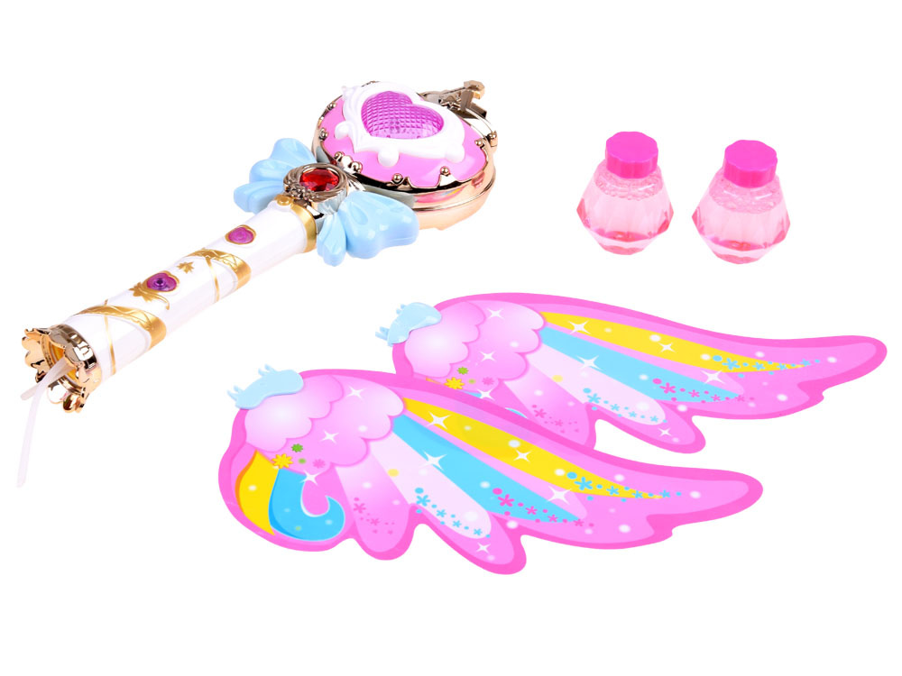 Interaktivní kouzelná hůlka, která vypouští mýdlové bubliny, je dokonalou rekvizitou pro všechny malé víly, které milují kouzla a seznamování se světem pohádek, bájí a kouzel. Roztomilá hůlka s duhovými křídly má tlačítko, kterým hračka vypouští barevné mýdlové bubliny, hraje veselou hudbu a svítí barevným světlem.