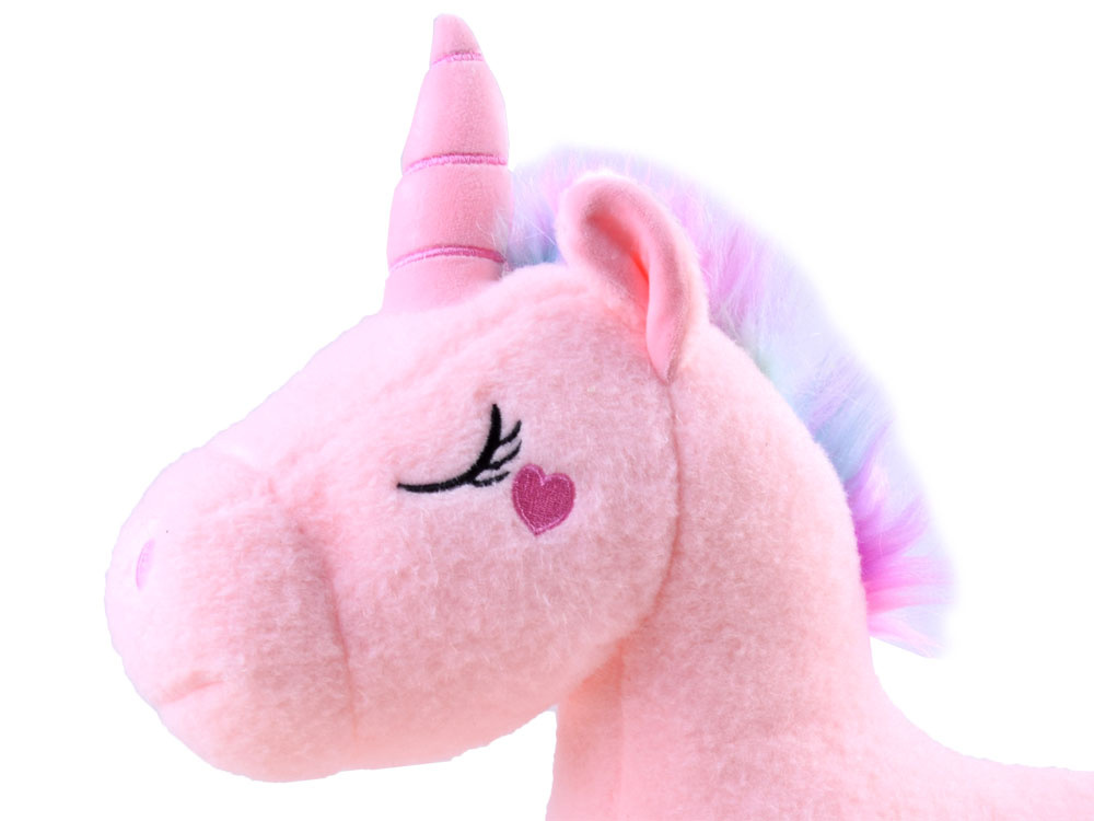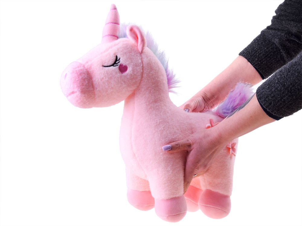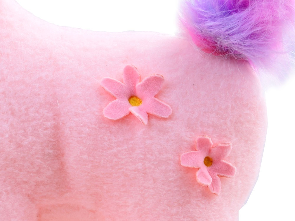 Kouzelný plyšový jednorožec je maskot stvořený k mazlení. Plyšák je vyroben z měkkého materiálu v krásných pastelových barvách. Hlavu maskota zdobí růžový měkký roh, barevná růžová a modrá hříva a srdce na tváři, zatímco jednorožec má na boku dva růžové květy. Chlupatý ocas byl také ponechán v růžové a modré barvě.