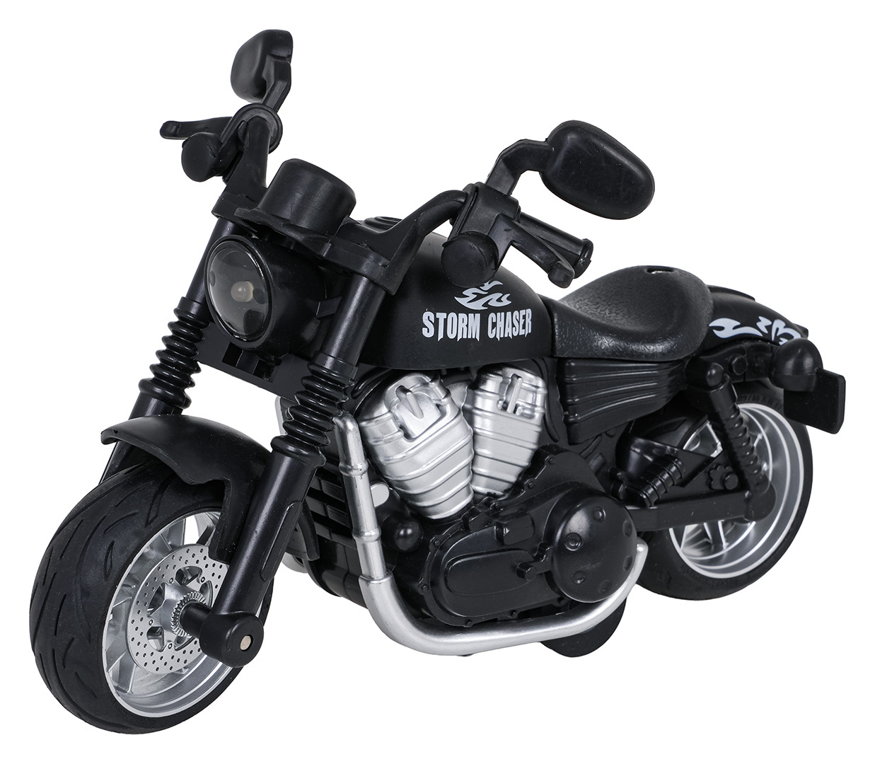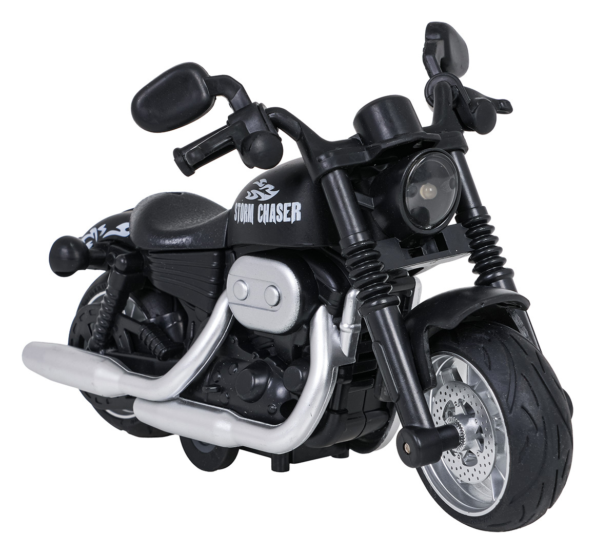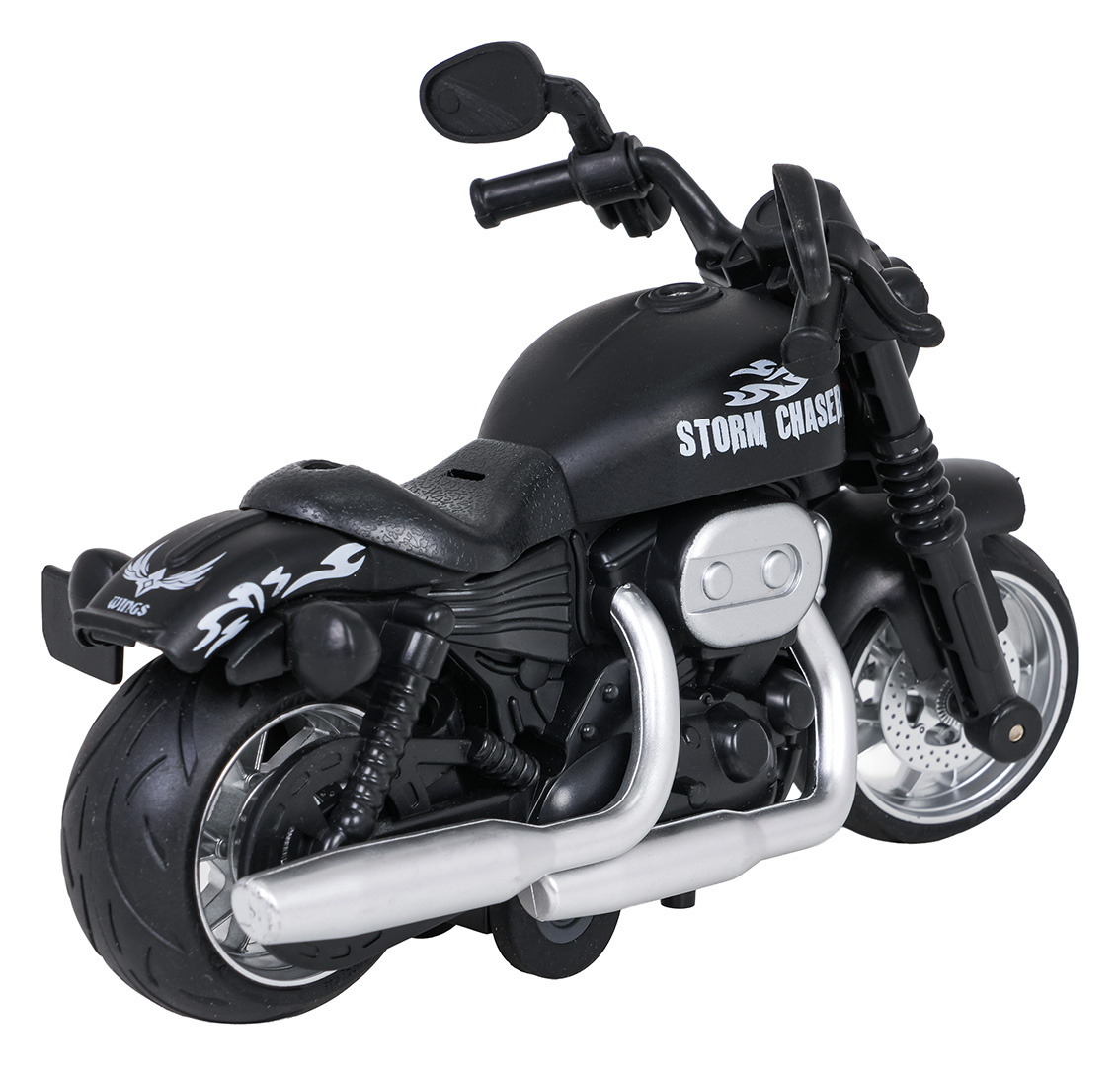 Kovový model motocyklu se zvukovým a světelným efektem a pohonem pro děti od tří let. Model byl vyroben s důrazem na detaily, má kovovou karoserii a gumové pneumatiky, které dobře drží na povrchu. Hračka je vybavena pohonem pull back, a po stisknutí zadního kola je slyšet zvuky startování vozidla a přední světlomet bliká. Hračka je napájena bateriemi typu 3 x AG3 (v balení).