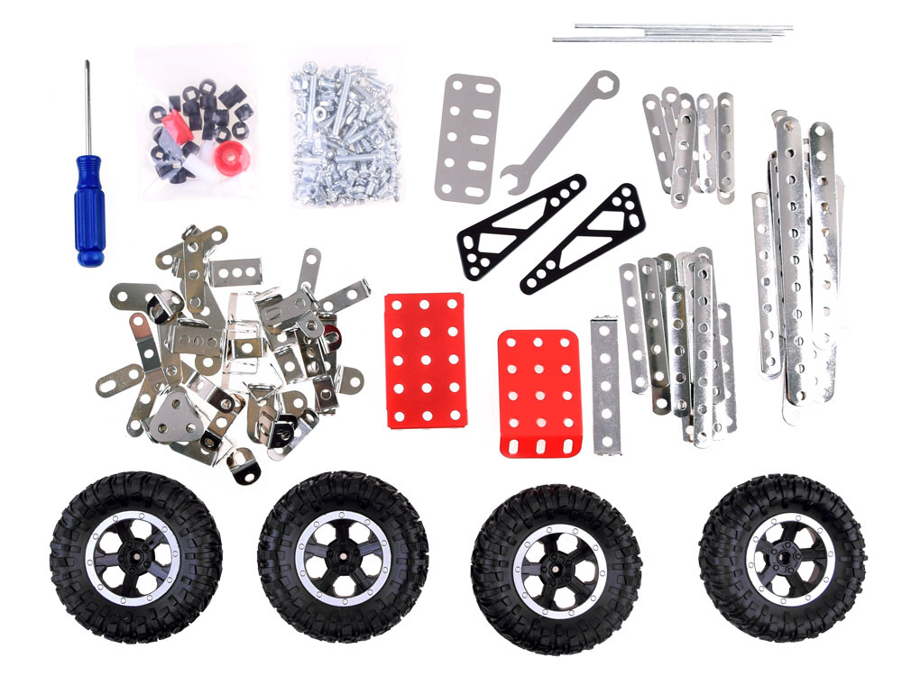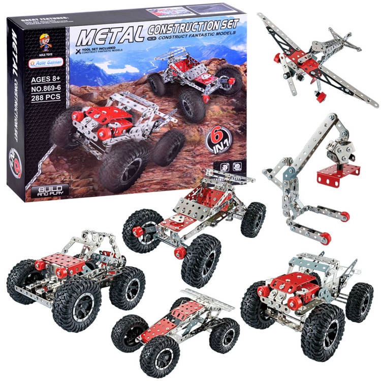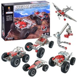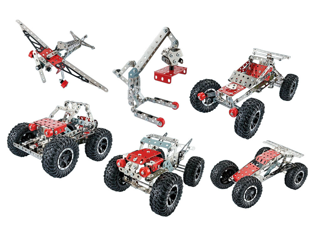 Kovové stavebnice jsou ideální pro každého malého kutila nebo technika. Sada kovových dílů různých tvarů vám umožní postavit terénní auto, závodní vůz nebo letadlo. Změna konceptu je samozřejmě vítána, vše záleží na fantazii a schopnostech dítěte.