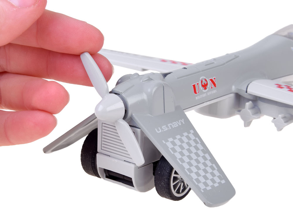 Model je vyroben z kovu a plastu v neutrálních maskovacích barvách. Dron má skládací křídla a pohyblivou vrtuli. Velkou předností modelu je pohon pull-back - stačí hračku zatáhnout dozadu a pustit, aby se rozjela dopředu. Jakmile hračka zrychlí, aktivuje se také vrtule a začne se otáčet.Přitlačením hračky na rovný povrch se aktivují zvukové a světelné funkce . uslyšíme vzlet a zvuk motorů, střelbu, zvuky bitvy a zapnutí kabinových a zadních světel. Dron byl vyroben s důrazem na estetiku a detaily.