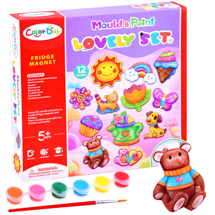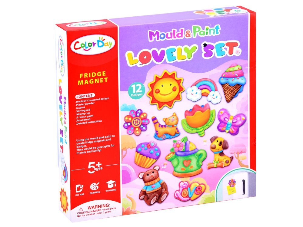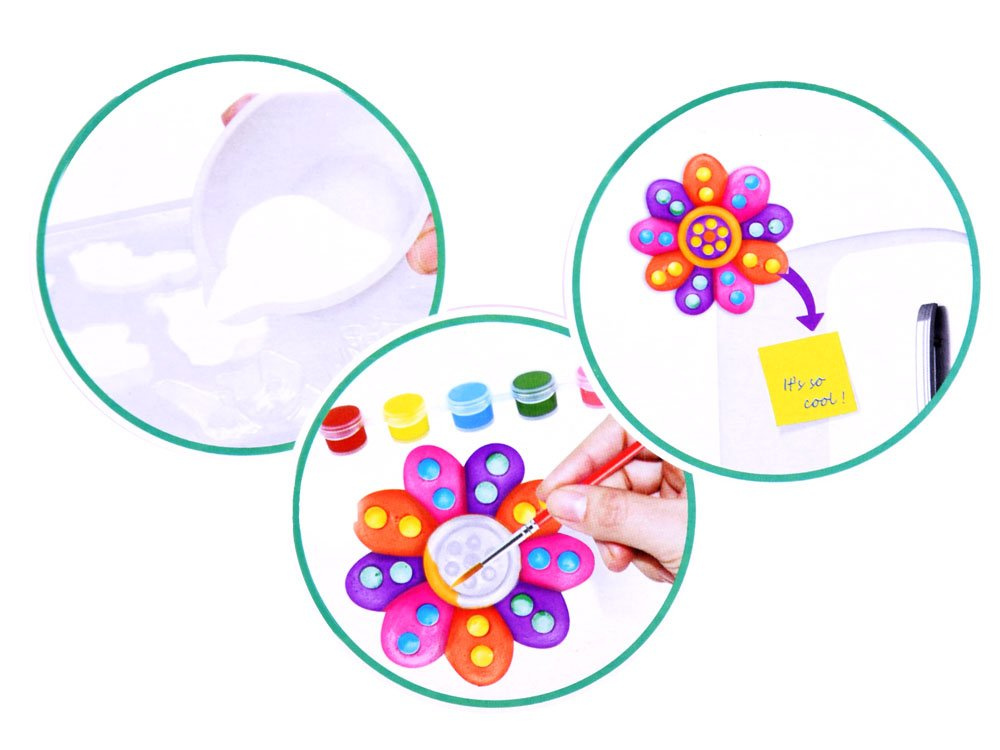 Jedná se o skvělou sadu pro kreativní hru, ze které si můžete vyrobit magnetky na ledničku ve tvaru slunce, květin, motýla, duhy, zmrzliny, dortíku, medvídka, konve, koťátka, nápisu LOVE. Dítě si musí odlitek samo připravit a poté jej namalovat podle svých představ.