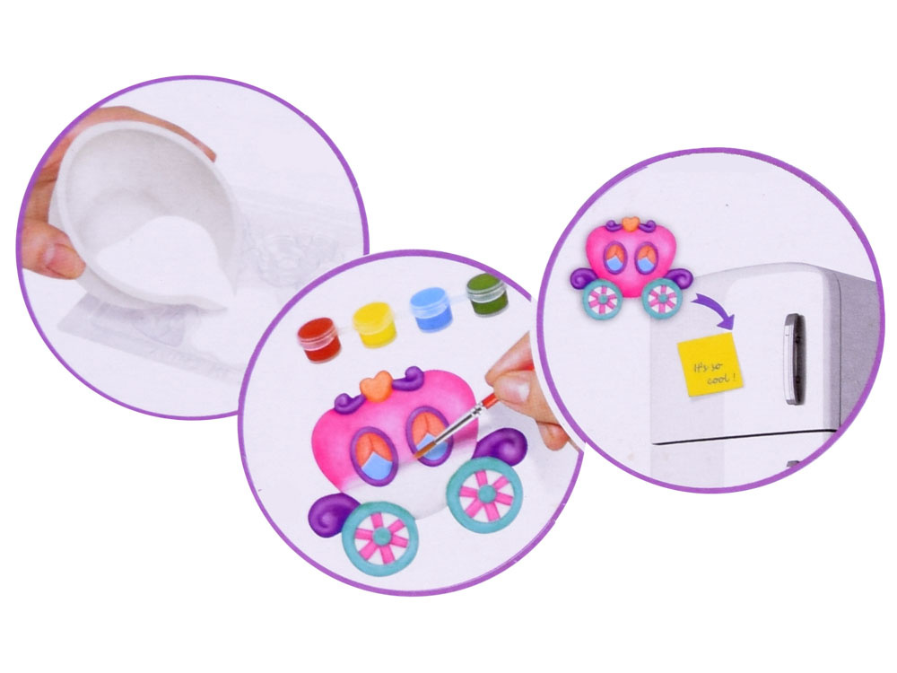Jedná se o skvělou sadu pro kreativní hru, ze které si můžete vyrobit magnetky na ledničku ve tvaru královny, princezny, kočáru, koruny, motýla a střevíčku. Dítě si musí odlitek samo připravit a poté jej namalovat podle svých představ.