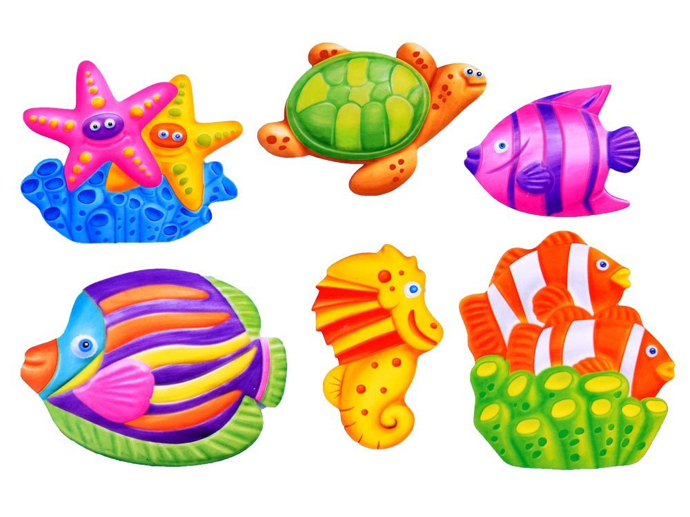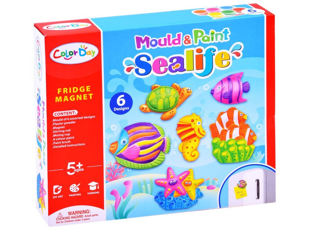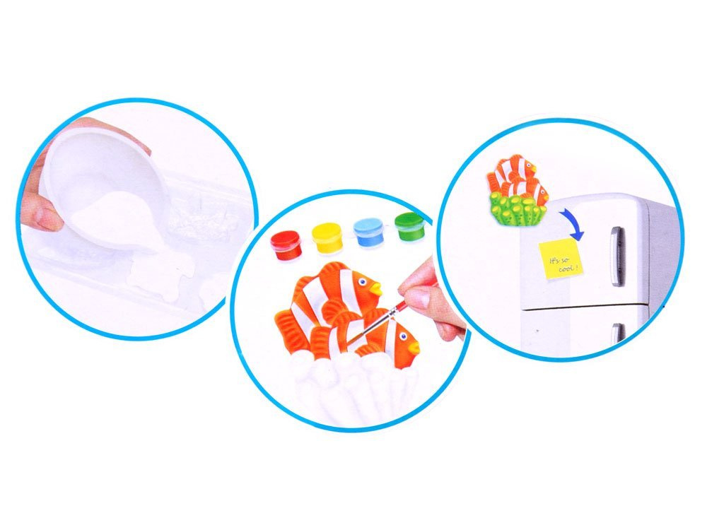 Jedná se o skvělou sadu pro kreativní hru při výrobě magnetek na ledničku ve tvaru obyvatel podmořského světa (ryby, mořský koník, hvězdice a želva). Dítě si musí odlitek samo připravit a poté jej namalovat podle svých představ.