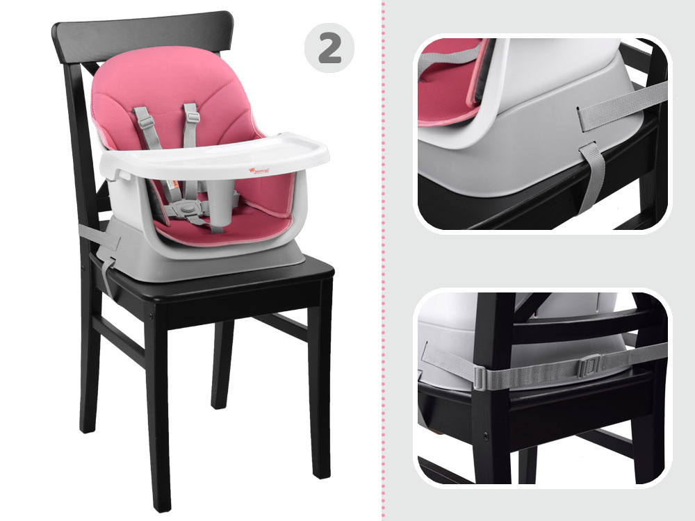 Sedačka má jednoduchou montáž, takže nezpůsobí žádné potíže při úpravě nábytku. Vše funguje na jedno kliknutí, je stabilní a bezpečné. Samotná židlička má pětibodové bezpečnostní pásy a pojistku mezi nohama dítěte, která zabraňuje sklouznutí dítěte. Popruhy pro připevnění sedačky k židli jsou pevné, takže dítě může sedět s rodiči u stolu a společně konzumovat jídlo.