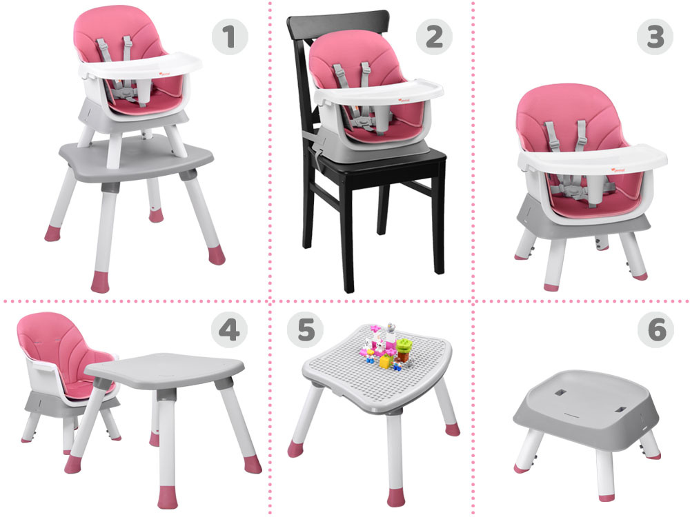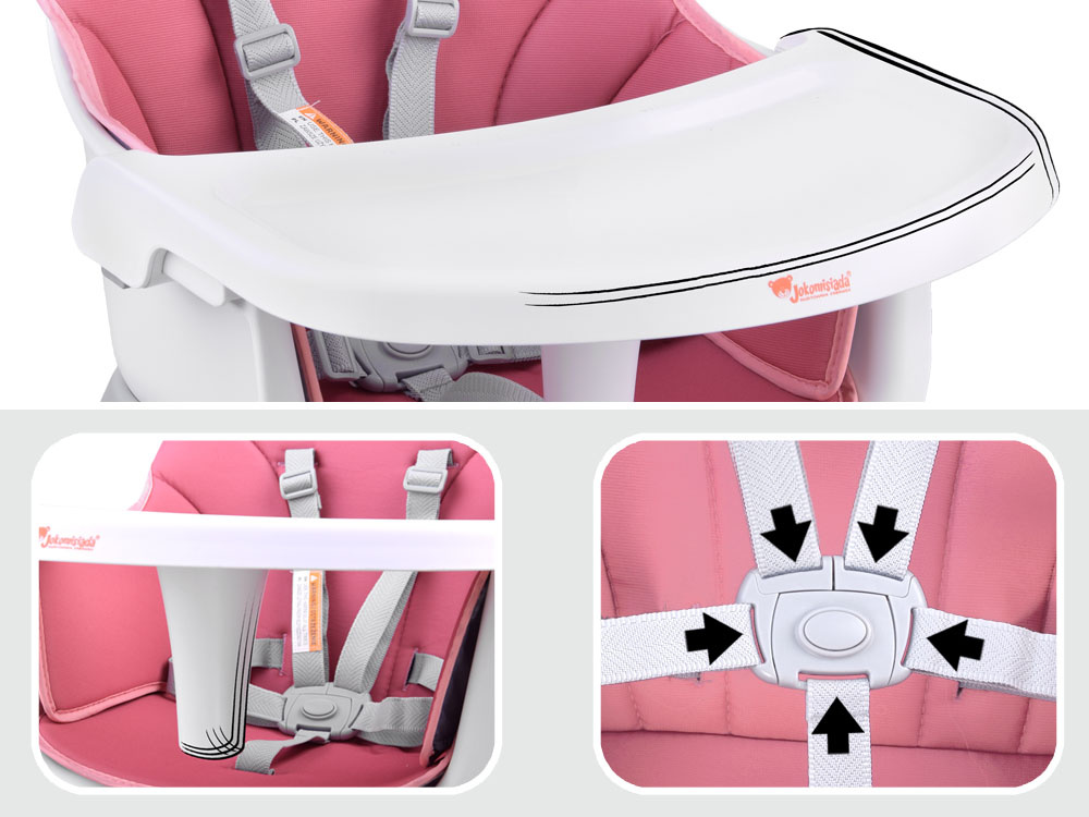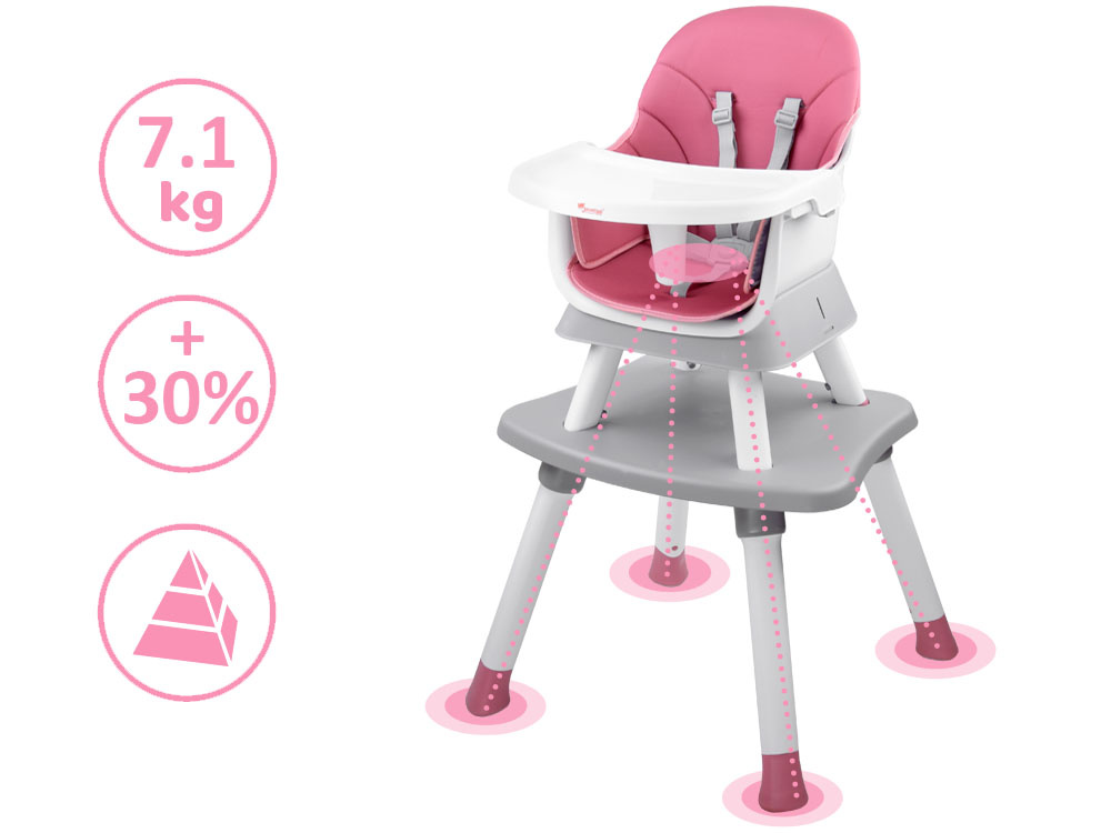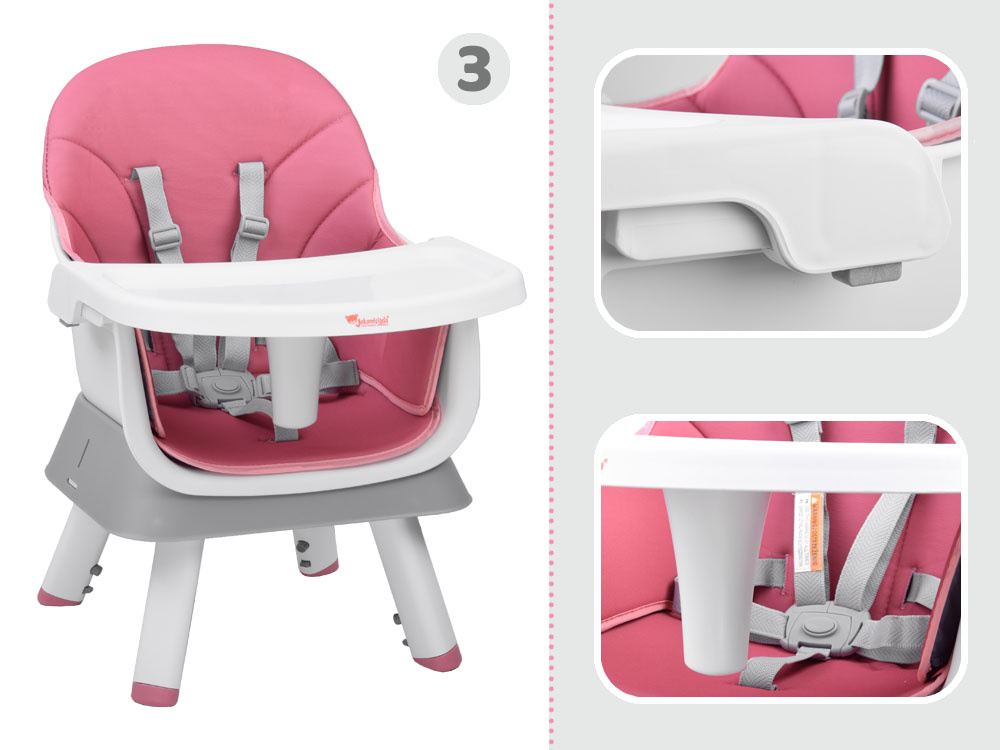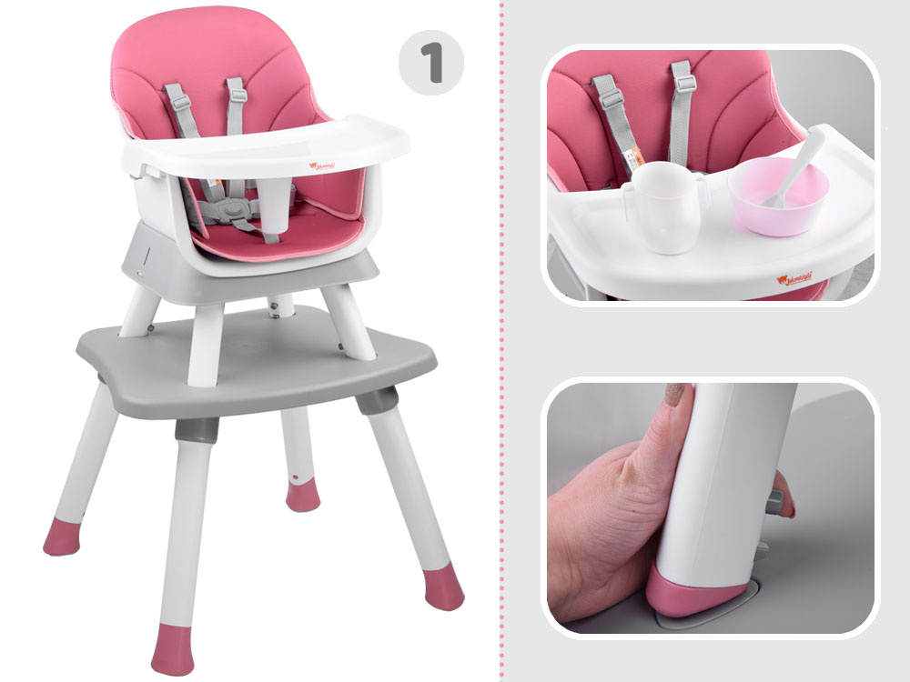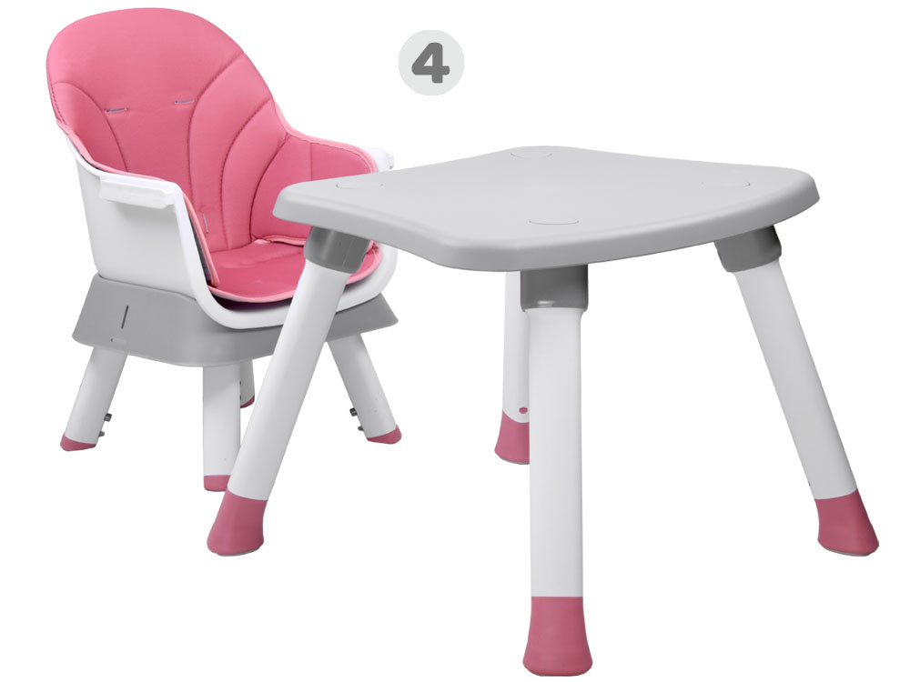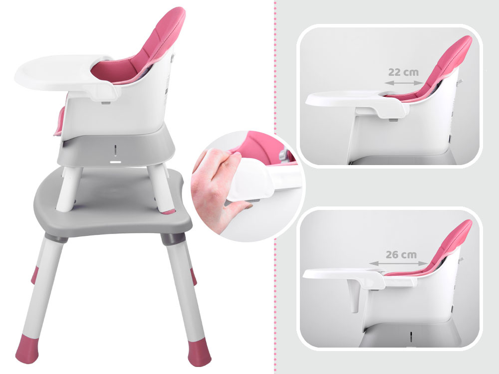 Židlička na krmení 6v1 ideální pro děti již od 6 měsíců, které začaly samostatně sedět. Modulární nábytek v moderním stylu se hodí do každého dětského pokoje, obývacího pokoje nebo kuchyně. Díky své variabilitě se hodí k jídelnímu stolu i do dětského koutku. Pohodlné sedadlo, správně tvarované, s pětibodovými bezpečnostními pásy a protiskluzovým zámkem. Čalounění sedadla je prodyšné a vyrobené ze snadno čistitelného materiálu, což je důležité pro udržení čistoty nábytku. Nábytek má odnímatelný, snadno čistitelný podnos. Nohy židle mají protiskluzové podložky. Tento multifunkční kus nábytku poroste s dítětem a snadno se přizpůsobí potřebám dané situace.