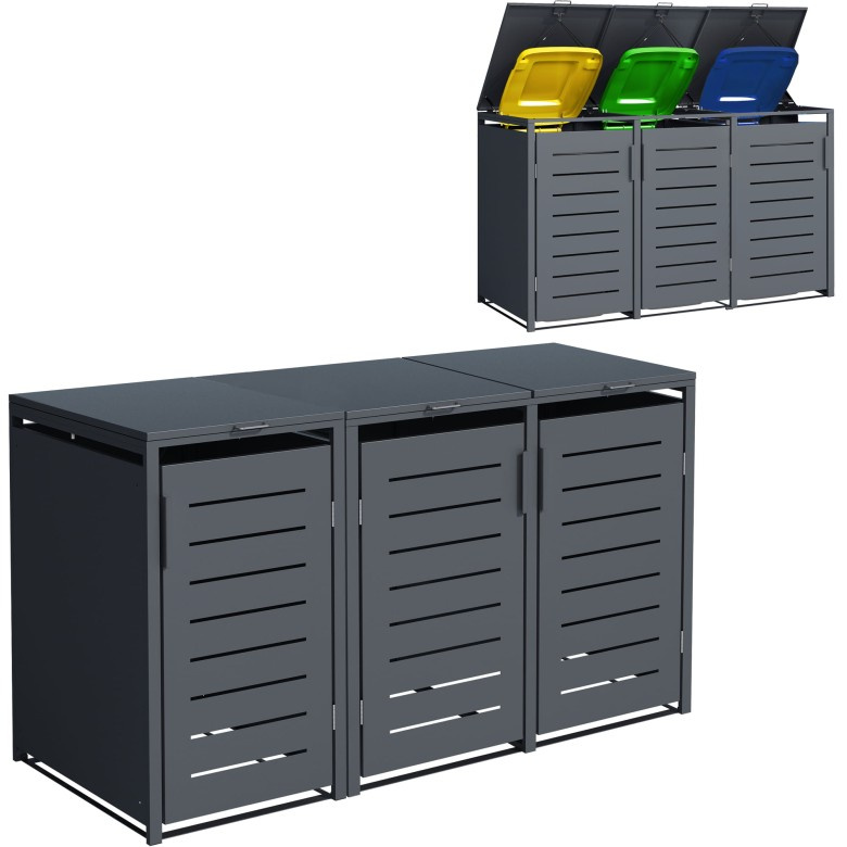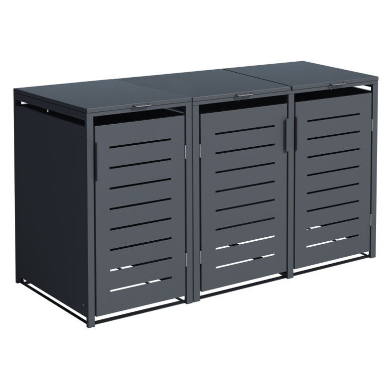 Kryt určený pro 3 koše o objemu 240 litrů Dvojitá dvířka s madly. Spojovací materiál, závěsy, zámky Skříň má přední dveře pro vstup do kontejneru a zvedací klapku s výškovým zámkem. Materiály odolné vůči měnícím se povětrnostním podmínkám, trvanlivé a bezúdržbové. Moderní, estetický design zástavby. Lehká, ale robustní konstrukce umožňuje, aby nástavbu přemisťovaly dvě osoby Nástavba má otevírací horní klapku pro snadný přístup k odpadkovým košům Horní klapka je vybavena speciálně zvolenou plynovou pružinou, která ji pomáhá otevřít a udržet v optimálním úhlu. K ochraně konstrukce při zavřené klapce se používají speciální tlumicí nárazníky. ✅ PLYNOVÁ Pružina - připevněná k horní klapce, která pomáhá při jejím otevírání a zastavení ve správné výšce ✅ AMORTIZAČNÍ ZÁMKY - systém pomalého klesání pro ochranu konstrukce ✅ OTEVÍRATELNÁ HORNÍ KLAPKA - pro snadný přístup k odpadkovým košům a rukojeť, ke které lze připevnit klapku odpadkového koše, aby ji bylo možné otevřít společně s krycí klapkou ✅ MAGNETICKÝ ZÁMEK - pro zabránění otevření dveří