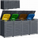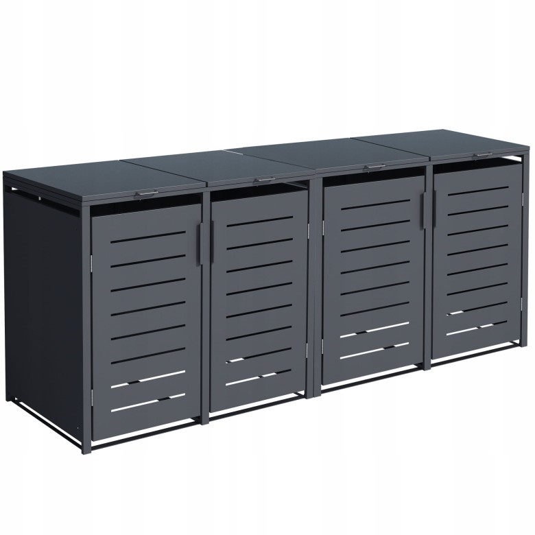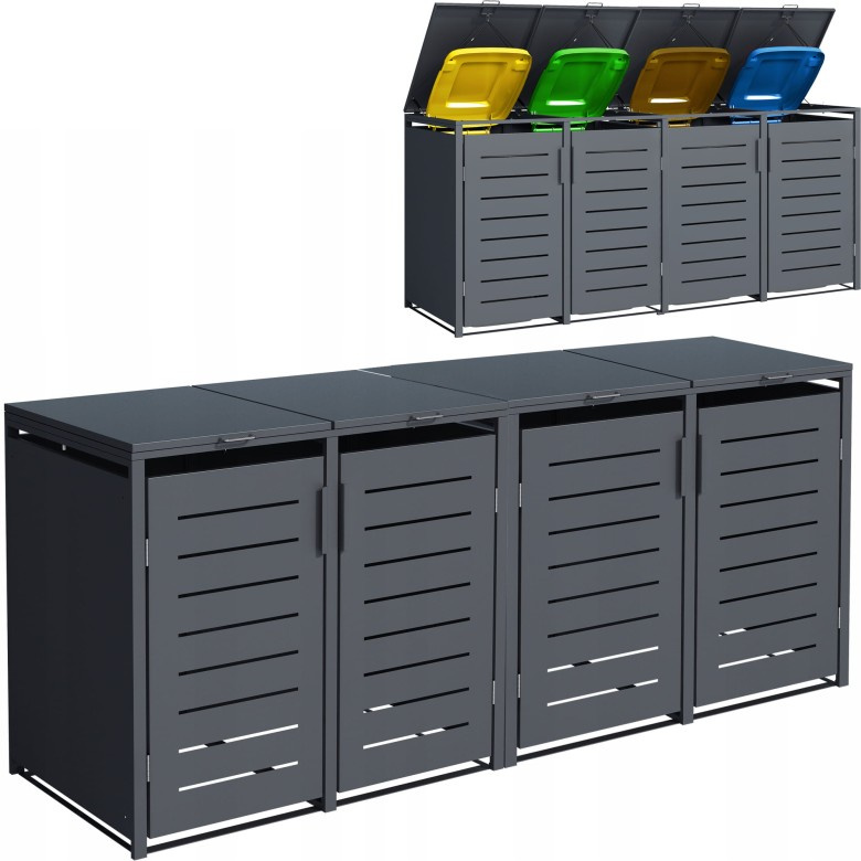 Kryt určený pro 4 koše o objemu 240 litrů Dvojitá dvířka s madly. Spojovací materiál, závěsy, zámky Skříň má přední dveře pro vstup do kontejneru a zvedací klapku s výškovým zámkem. Materiály odolné vůči měnícím se povětrnostním podmínkám, trvanlivé a bezúdržbové. Moderní, estetický design zástavby. Lehká, ale robustní konstrukce umožňuje, aby nástavbu přemisťovaly dvě osoby Nástavba má otevírací horní klapku pro snadný přístup k odpadkovým košům Horní klapka je vybavena speciálně zvolenou plynovou pružinou, která ji pomáhá otevřít a udržet v optimálním úhlu. K ochraně konstrukce při zavřené klapce se používají speciální tlumicí nárazníky. ✅ PLYNOVÁ Pružina - připevněná k horní klapce, která pomáhá při jejím otevírání a zastavení ve správné výšce ✅ AMORTIZAČNÍ ZÁMKY - systém pomalého klesání pro ochranu konstrukce ✅ OTEVÍRATELNÁ HORNÍ KLAPKA - pro snadný přístup k odpadkovým košům a rukojeť, ke které lze připevnit klapku odpadkového koše, aby ji bylo možné otevřít společně s krycí klapkou ✅ MAGNETICKÝ ZÁMEK - pro zabránění otevření dveří
