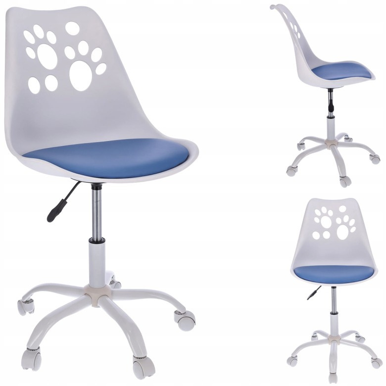 Židle z kolekce JOY Dokonale tvarované opěradlo s motivem psích tlapek v kombinaci s měkkým polštářem umístěným na sedáku zajišťuje pohodlí, zatímco pětihvězdicová základna zakončená malými kolečky poskytuje skvělou stabilitu a chrání povrch před poškrábáním. Židle je vybavena pohonem, který umožňuje nastavit výšku sedadla podle potřeby.