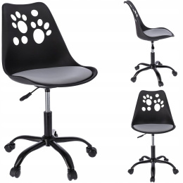 Židle z kolekce JOY Dokonale tvarované opěradlo s motivem psích tlapek v kombinaci s měkkým polštářem umístěným na sedáku zajišťuje pohodlí, zatímco pětihvězdicová základna zakončená malými kolečky poskytuje skvělou stabilitu a chrání povrch před poškrábáním. Židle je vybavena pohonem, který umožňuje nastavit výšku sedadla podle potřeby.