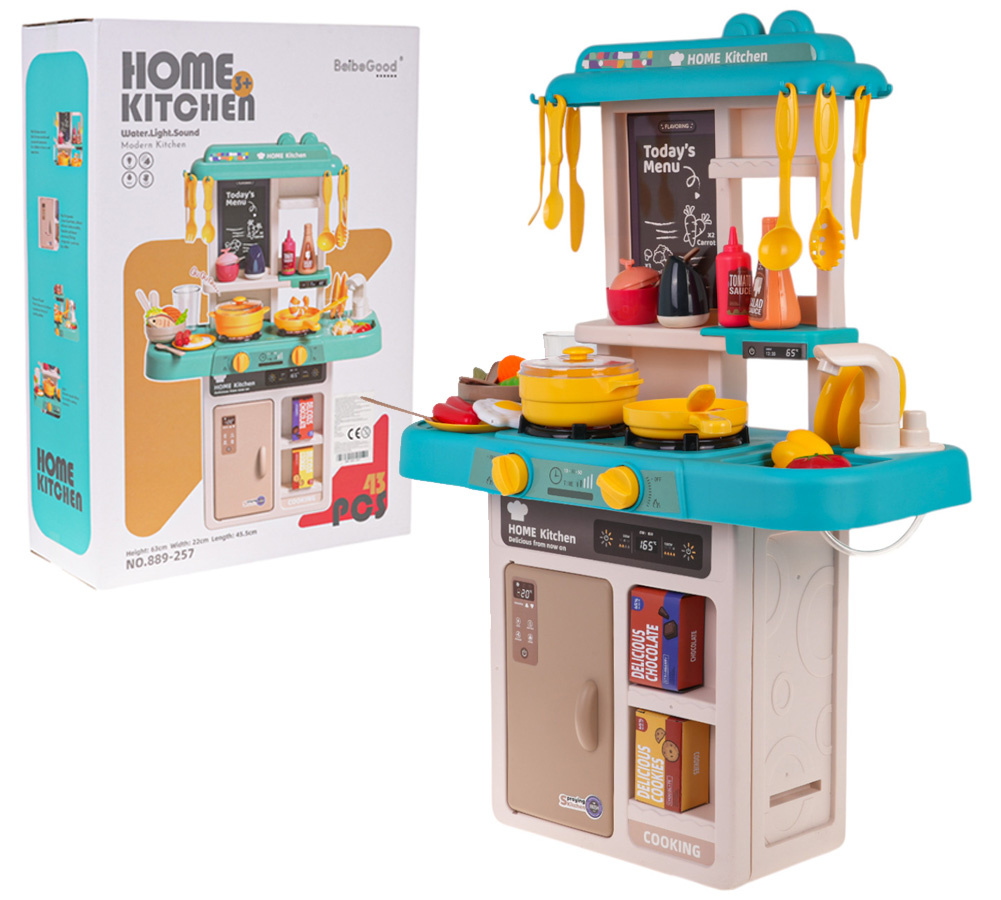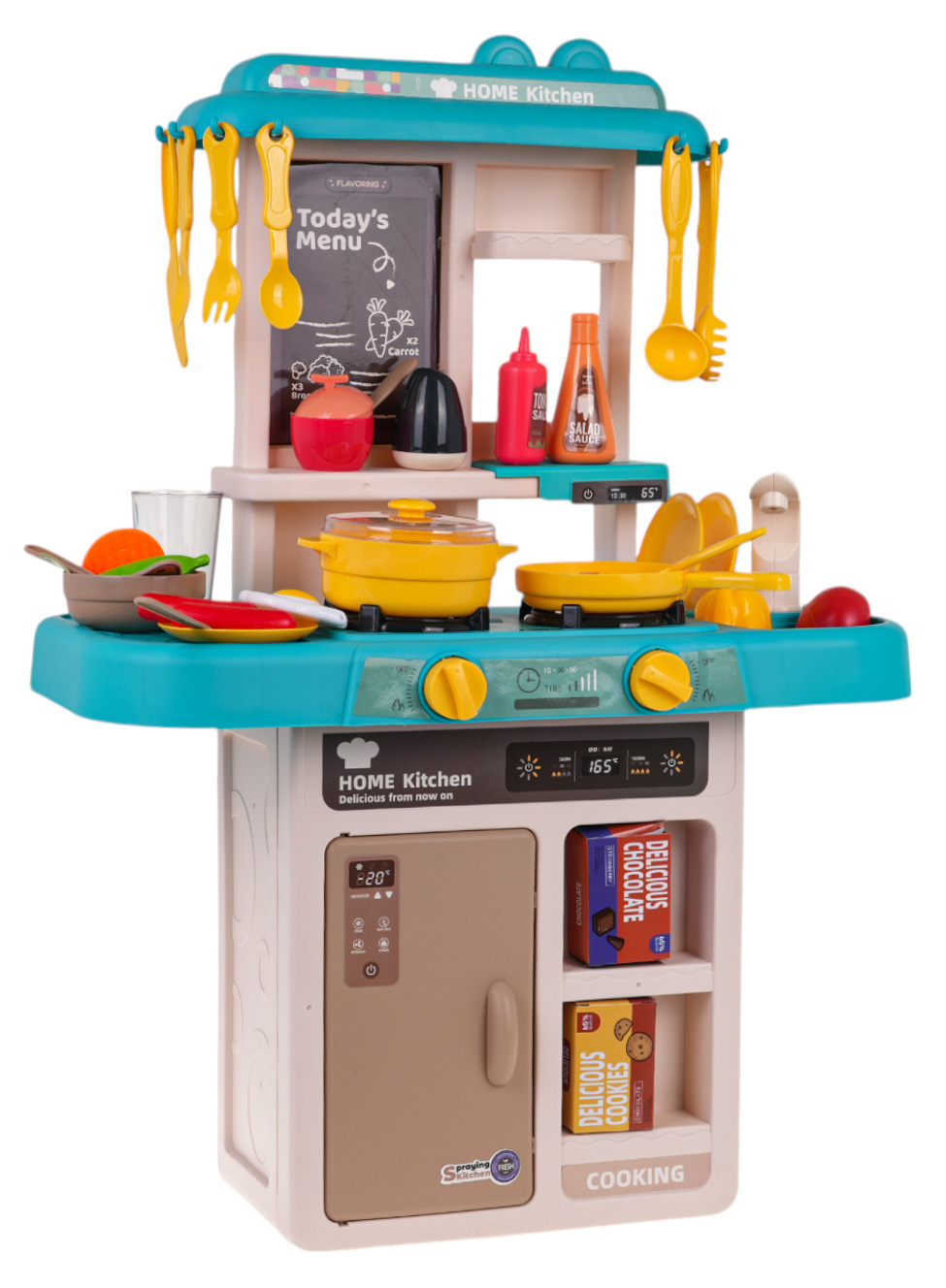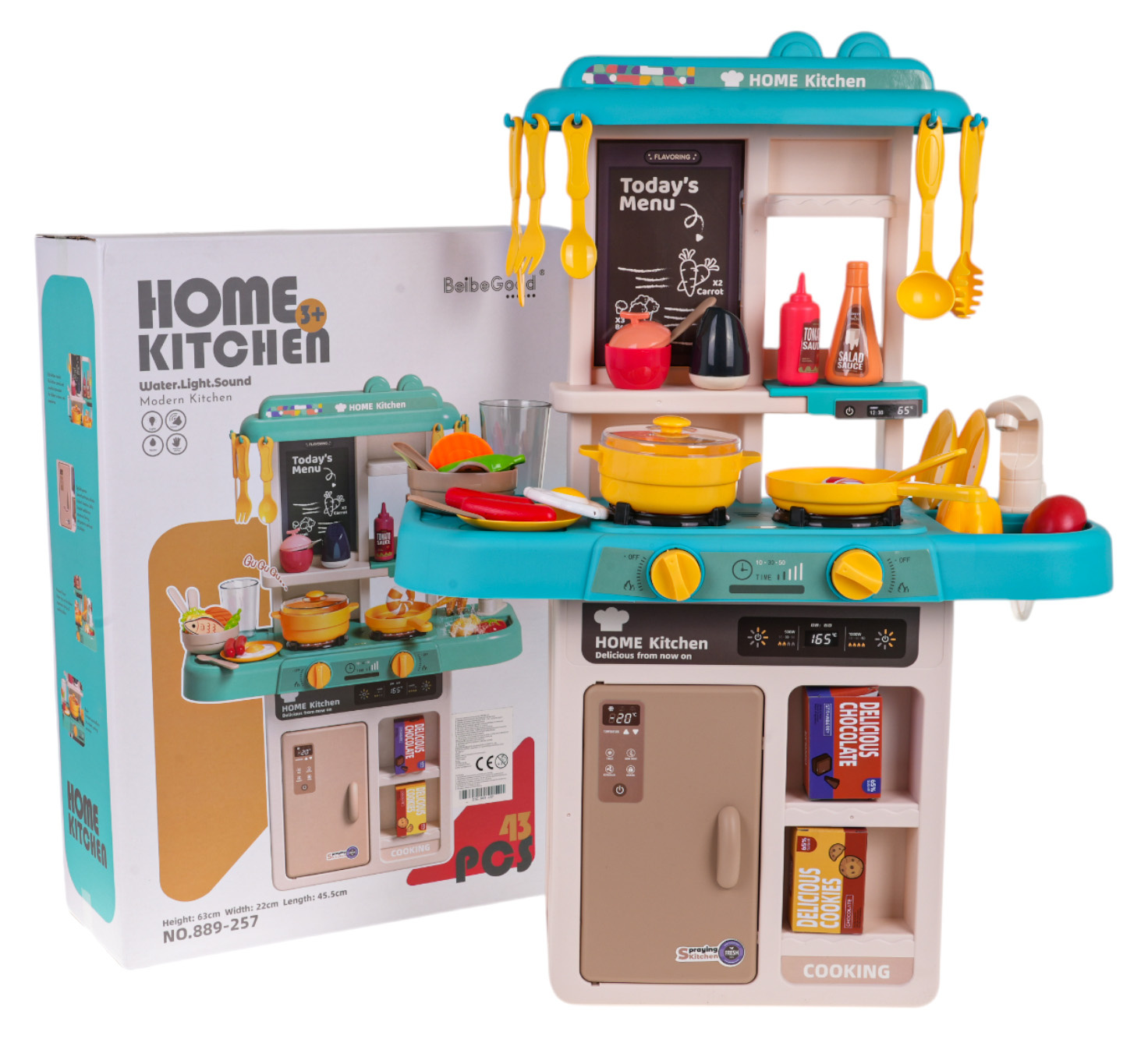 Interaktivní kuchyně s funkcí světla, zvuku a kohoutkem, ze kterého teče voda, a také s množstvím doplňků, pro děti od 3 let. Kuchyně byla skvěle provedena, z nejlepší kvality plastu a je v živých barvách, které dítě povzbuzují ke hře. Na kuchyňské desce se nachází interaktivní deska s hořáky. Po otočení jednoho z knoflíků je slyšet zvuky vaření a druhého, zvuky smažení. Zvukům vaření a smažení doprovází podsvícení hořáků. Z kohoutku skutečně teče voda, jako ve skutečném dřezu, dítě bude moci umýt hračkové nádobí. V sadě máme také maketu ledničky s otevíracími dvířky a poličky, na které můžeme umístit makety produktů. Celá sada vypadá skvěle. Hračka je napájena bateriemi typu 3 x AA 1,5 V (nejsou součástí balení).
