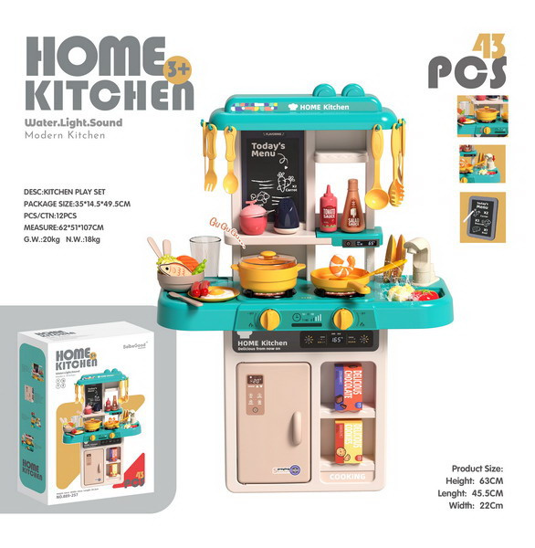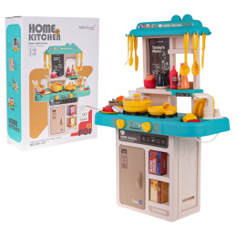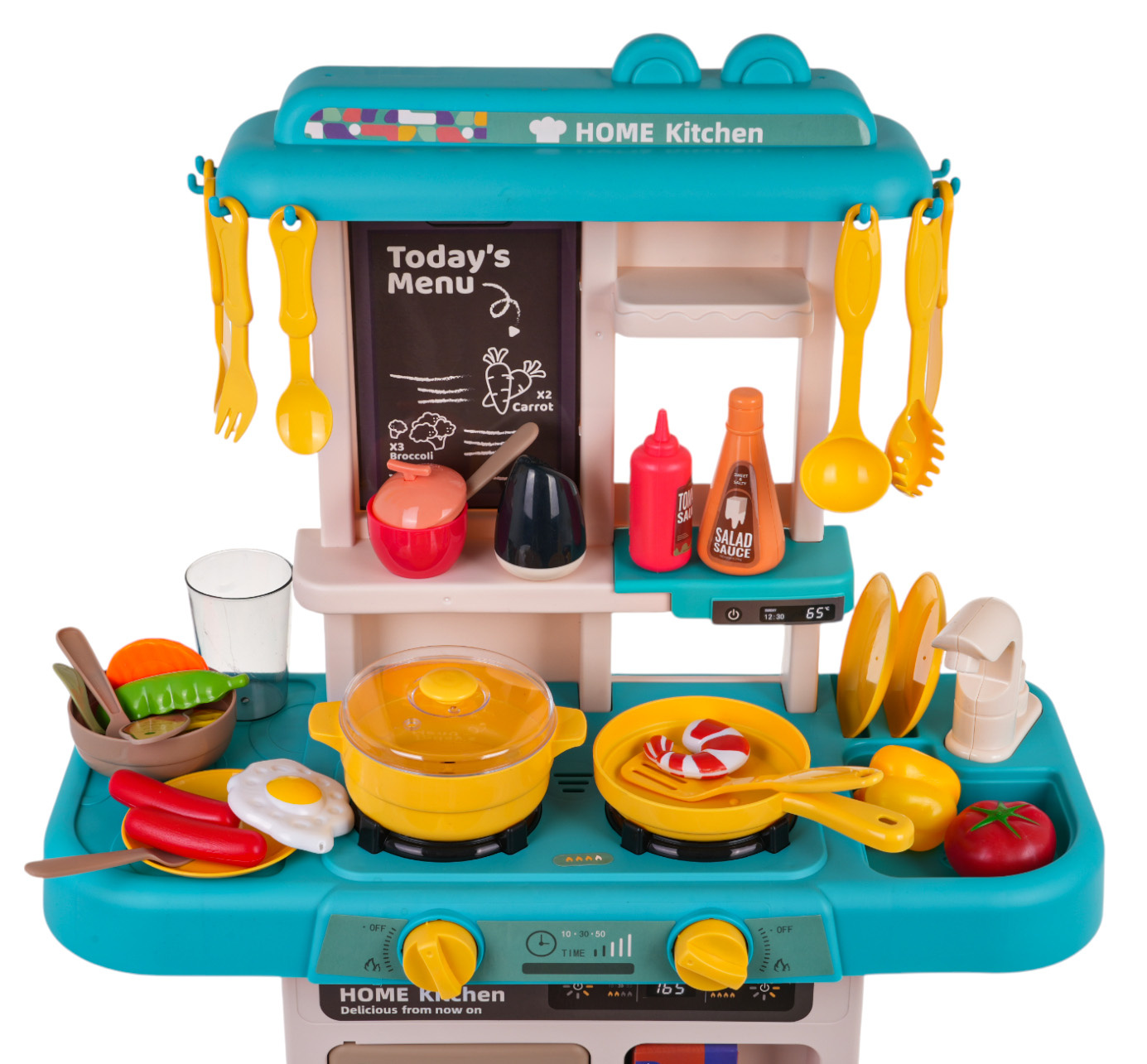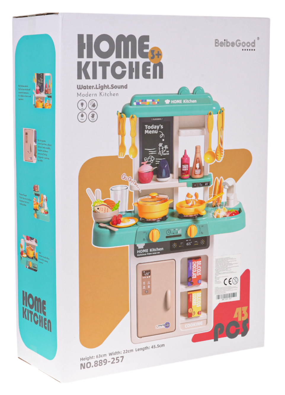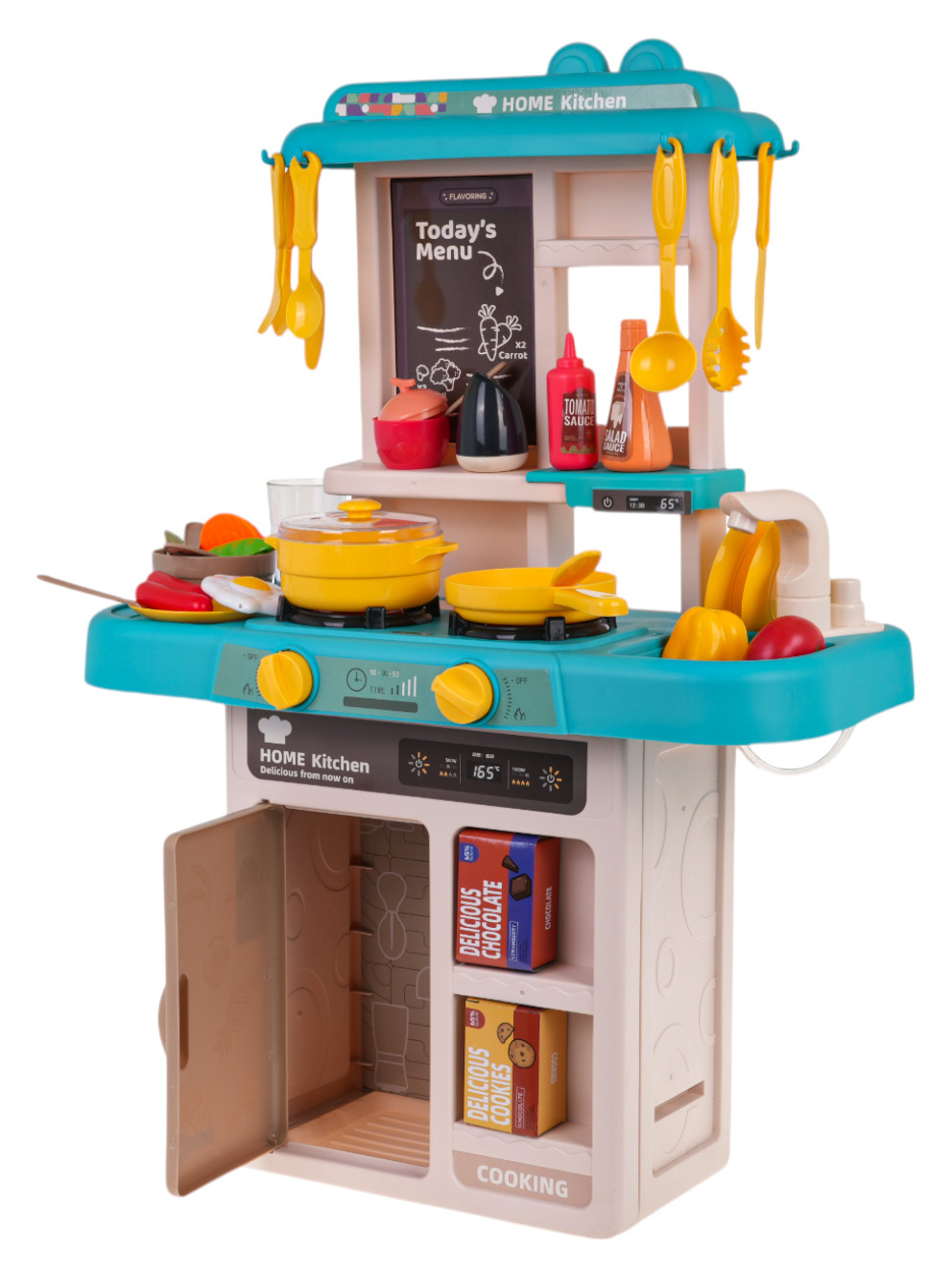 Interaktivní kuchyně s funkcí světla, zvuku a kohoutkem, ze kterého teče voda, a také s množstvím doplňků, pro děti od 3 let. Kuchyně byla skvěle provedena, z nejlepší kvality plastu a je v živých barvách, které dítě povzbuzují ke hře. Na kuchyňské desce se nachází interaktivní deska s hořáky. Po otočení jednoho z knoflíků je slyšet zvuky vaření a druhého, zvuky smažení. Zvukům vaření a smažení doprovází podsvícení hořáků. Z kohoutku skutečně teče voda, jako ve skutečném dřezu, dítě bude moci umýt hračkové nádobí. V sadě máme také maketu ledničky s otevíracími dvířky a poličky, na které můžeme umístit makety produktů. Celá sada vypadá skvěle. Hračka je napájena bateriemi typu 3 x AA 1,5 V (nejsou součástí balení).
