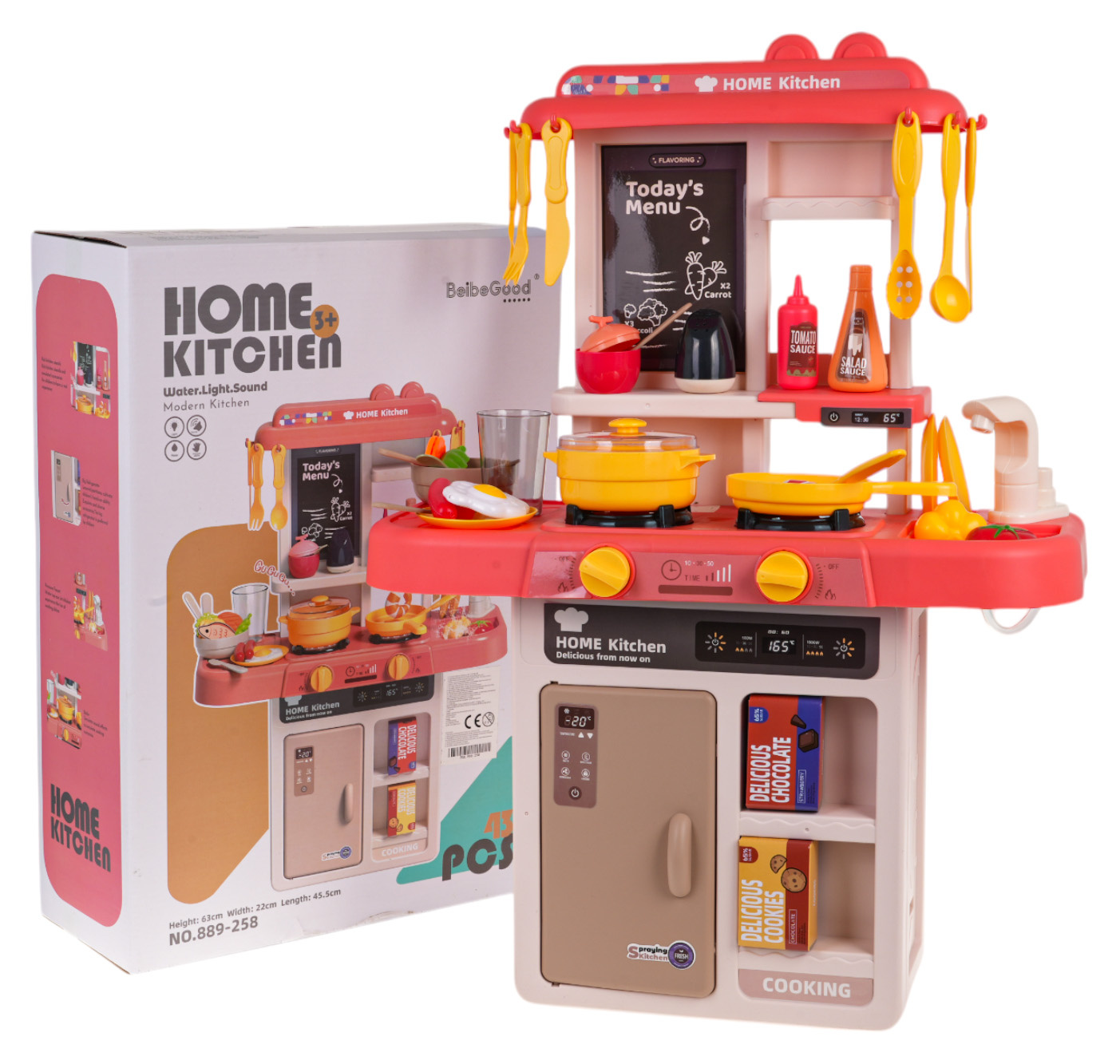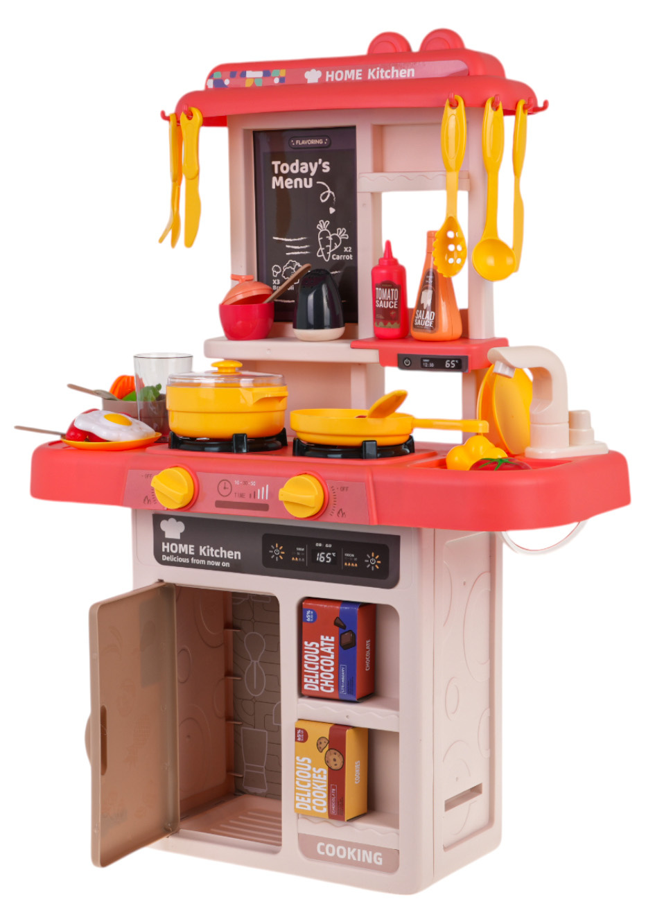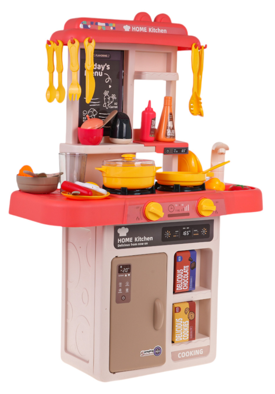 Interaktivní kuchyně s funkcí světla, zvuku a kohoutkem, ze kterého teče voda, a také s množstvím doplňků, pro děti od 3 let. Kuchyně byla skvěle provedena, z nejlepší kvality plastu a je v živých barvách, které dítě povzbuzují ke hře. Na kuchyňské desce se nachází interaktivní deska s hořáky. Po otočení jednoho z knoflíků je slyšet zvuky vaření a druhého, zvuky smažení. Zvukům vaření a smažení doprovází podsvícení hořáků. Z kohoutku skutečně teče voda, jako ve skutečném dřezu, dítě bude moci umýt hračkové nádobí. V sadě máme také maketu ledničky s otevíracími dvířky a poličky, na které můžeme umístit makety produktů. Celá sada vypadá skvěle. Hračka je napájena bateriemi typu 3 x AA 1,5 V (nejsou součástí balení).