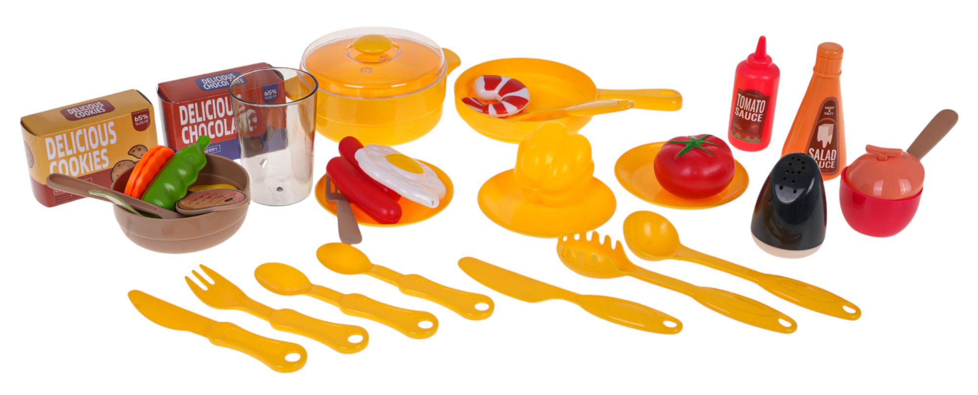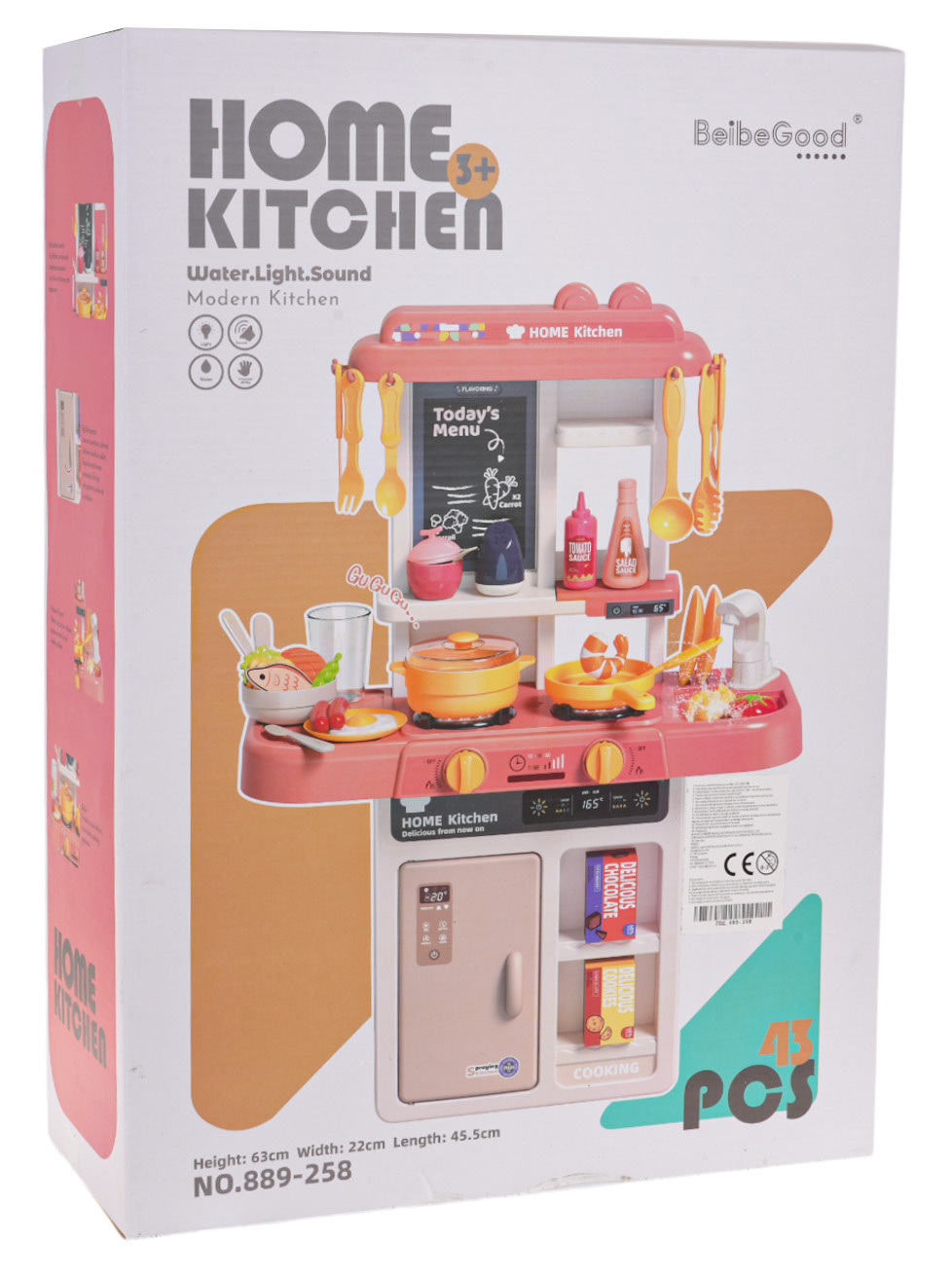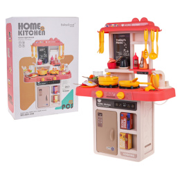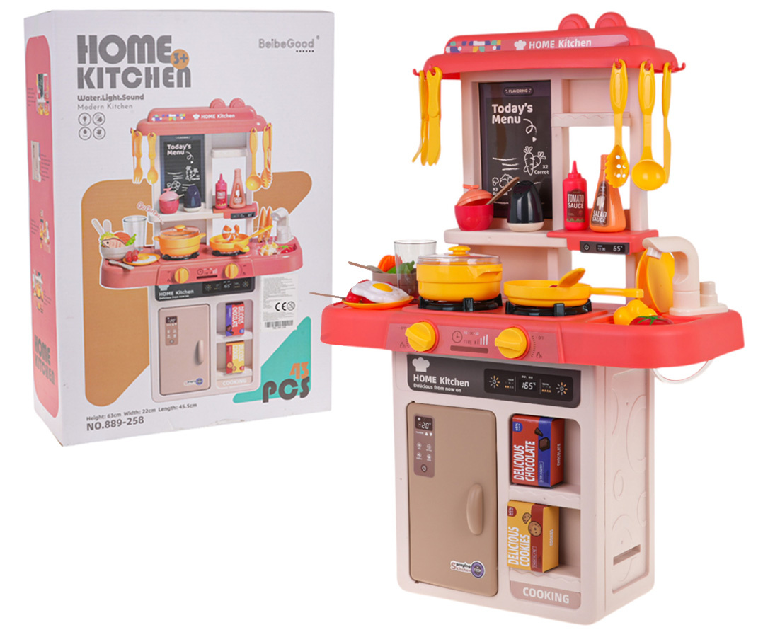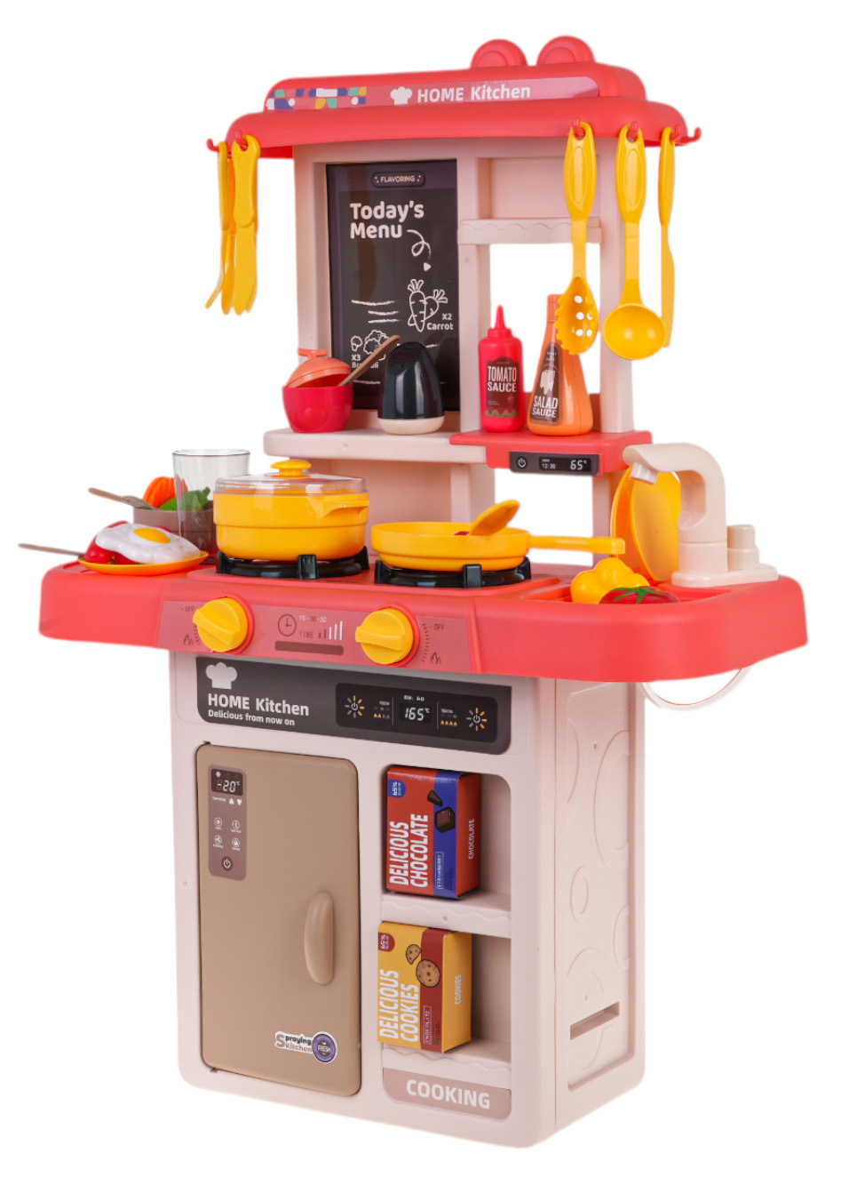 Interaktivní kuchyně s funkcí světla, zvuku a kohoutkem, ze kterého teče voda, a také s množstvím doplňků, pro děti od 3 let. Kuchyně byla skvěle provedena, z nejlepší kvality plastu a je v živých barvách, které dítě povzbuzují ke hře. Na kuchyňské desce se nachází interaktivní deska s hořáky. Po otočení jednoho z knoflíků je slyšet zvuky vaření a druhého, zvuky smažení. Zvukům vaření a smažení doprovází podsvícení hořáků. Z kohoutku skutečně teče voda, jako ve skutečném dřezu, dítě bude moci umýt hračkové nádobí. V sadě máme také maketu ledničky s otevíracími dvířky a poličky, na které můžeme umístit makety produktů. Celá sada vypadá skvěle. Hračka je napájena bateriemi typu 3 x AA 1,5 V (nejsou součástí balení).