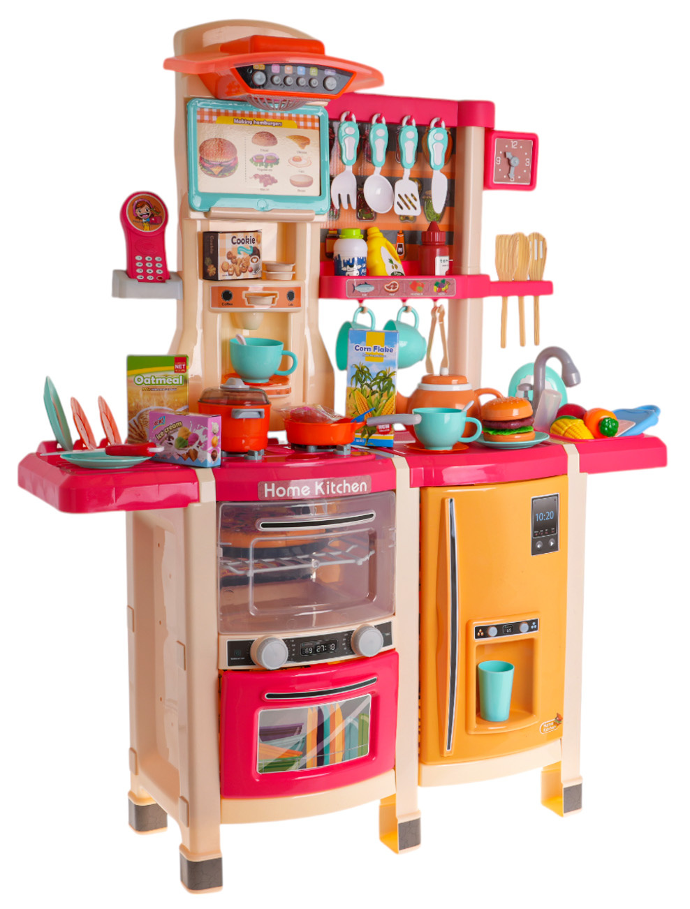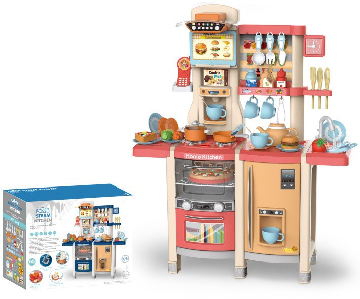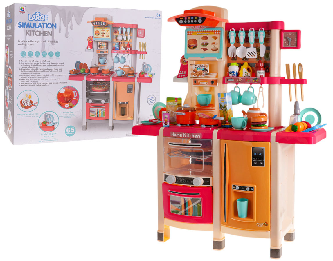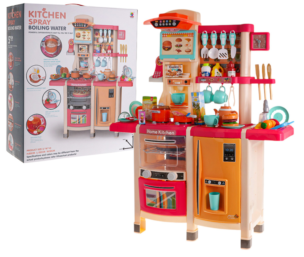 Interaktivní kuchyně s funkcí světla, zvuku a kohoutkem, ze kterého teče voda, a také s množstvím doplňků, pro děti od 3 let. Kuchyně byla skvěle provedena, z nejlepší kvality plastu a je v živých barvách, které dítě povzbuzují ke hře. Na kuchyňské desce se nachází interaktivní deska s hořáky. Po otočení jednoho z knoflíků je slyšet zvuky vaření a druhého, zvuky smažení. Zvukům vaření a smažení doprovází podsvícení hořáků. Z kohoutku skutečně teče voda, jako ve skutečném dřezu, dítě bude moci umýt hračkové nádobí. V sadě máme také atrapu ledničky s otevíracími dvířky a dávkovačem vody, otevírací troubu se zvukovými a světelnými efekty, myčku, kávovar, panel s ventilátorem a zvukovými a světelnými efekty, telefon s zvukem a světlem a spoustu poliček, na které můžeme umístit atrapy produktů. Celá sada vypadá skvěle. Hračka je napájena bateriemi typu 6 x AA 1,5 V (nejsou součástí balení) a 2 x AAA 1,5 V (nejsou součástí balení).