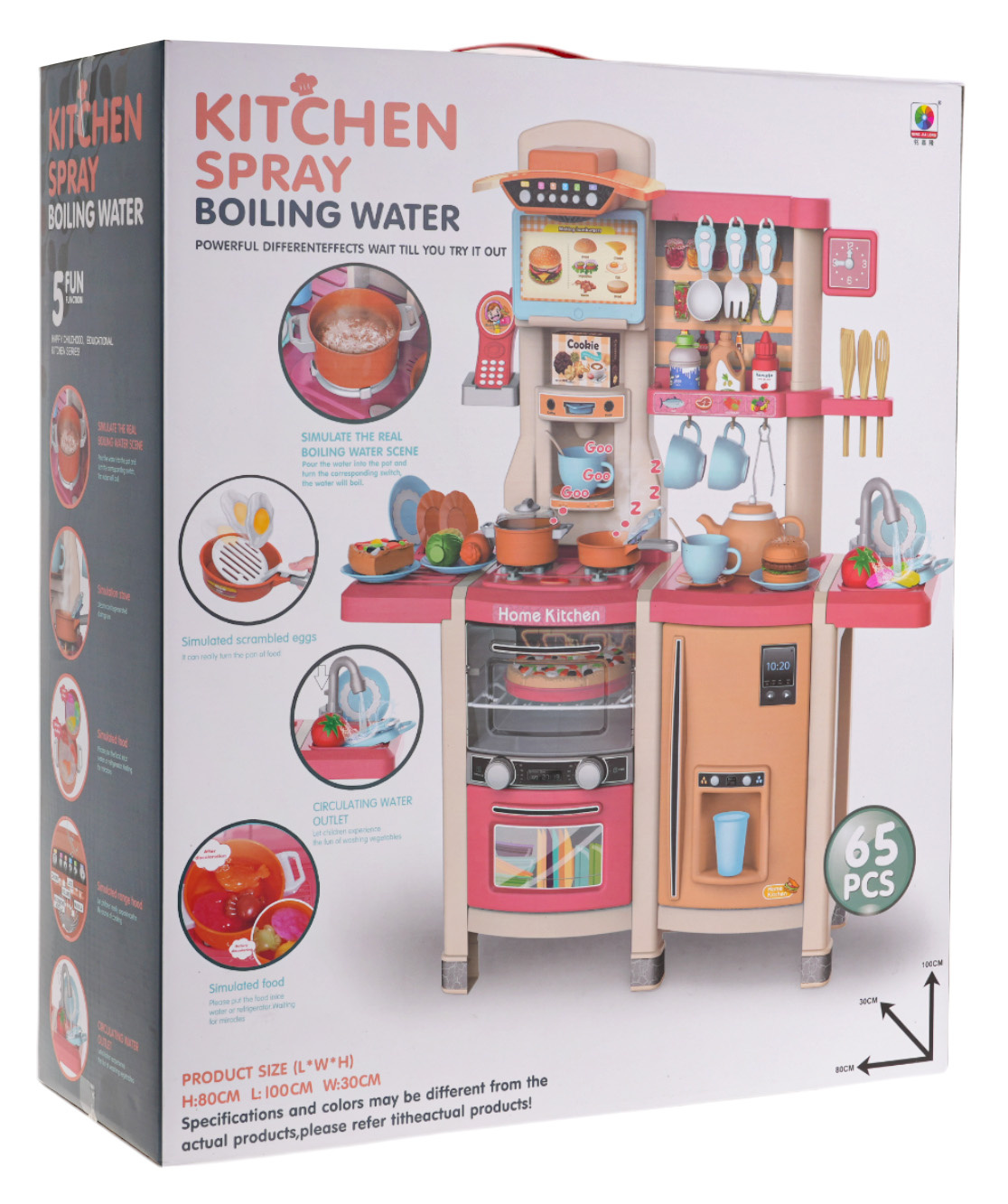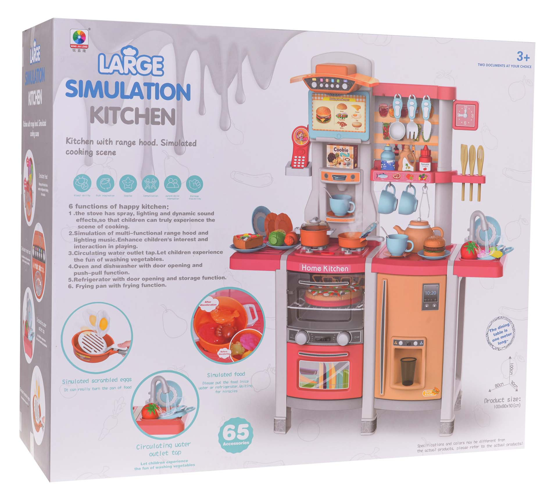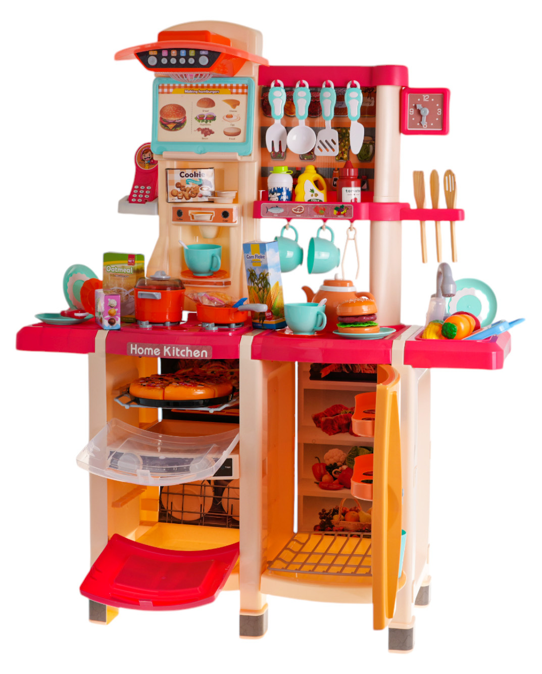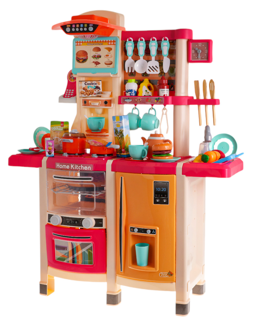 Interaktivní kuchyně s funkcí světla, zvuku a kohoutkem, ze kterého teče voda, a také s množstvím doplňků, pro děti od 3 let. Kuchyně byla skvěle provedena, z nejlepší kvality plastu a je v živých barvách, které dítě povzbuzují ke hře. Na kuchyňské desce se nachází interaktivní deska s hořáky. Po otočení jednoho z knoflíků je slyšet zvuky vaření a druhého, zvuky smažení. Zvukům vaření a smažení doprovází podsvícení hořáků. Z kohoutku skutečně teče voda, jako ve skutečném dřezu, dítě bude moci umýt hračkové nádobí. V sadě máme také atrapu ledničky s otevíracími dvířky a dávkovačem vody, otevírací troubu se zvukovými a světelnými efekty, myčku, kávovar, panel s ventilátorem a zvukovými a světelnými efekty, telefon s zvukem a světlem a spoustu poliček, na které můžeme umístit atrapy produktů. Celá sada vypadá skvěle. Hračka je napájena bateriemi typu 6 x AA 1,5 V (nejsou součástí balení) a 2 x AAA 1,5 V (nejsou součástí balení).