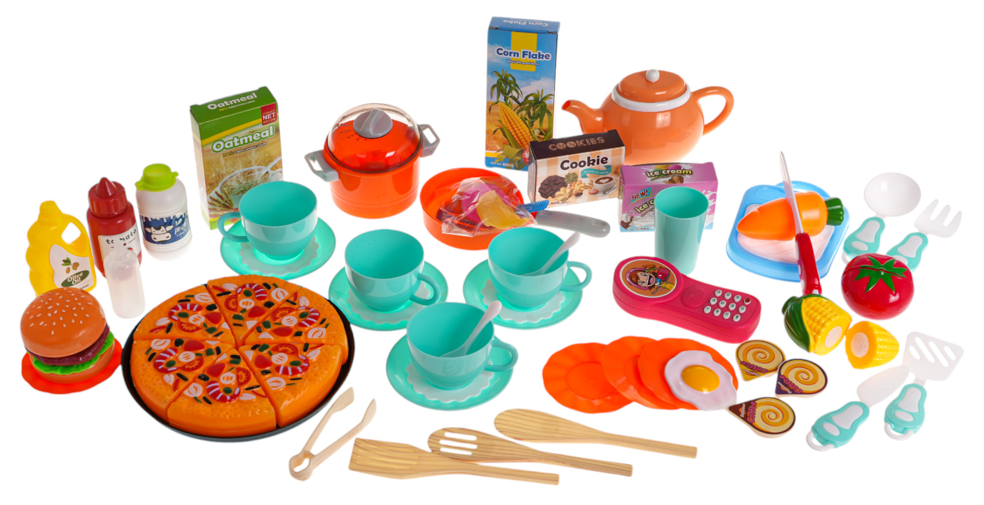 - atrapy produktů: rajče na suchý zip, kukuřice na suchý zip, mrkev na suchý zip, volské oko, pizza (6 kousků na suchý zip), ryba, krab, hamburger se salátem a masem na suchý zip,